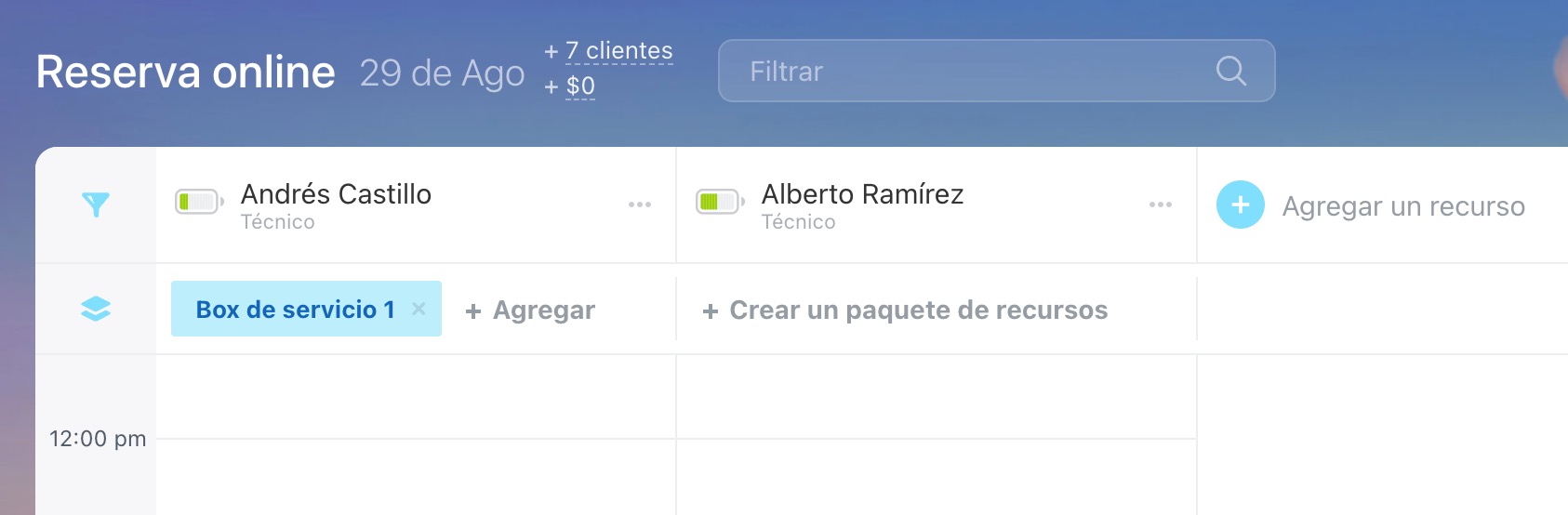 - Crea dos tipos de recursos: principales (técnicos) y adicionales (boxes de servicio).