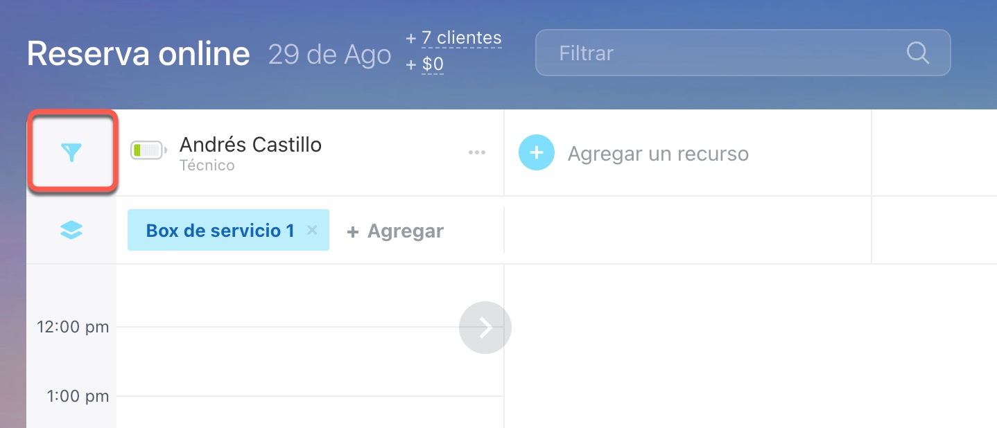 Si es necesario, puedes mostrar el recurso adicional en el panel de programación haciendo clic en el icono de embudo para crear una vista personalizada para el agente.