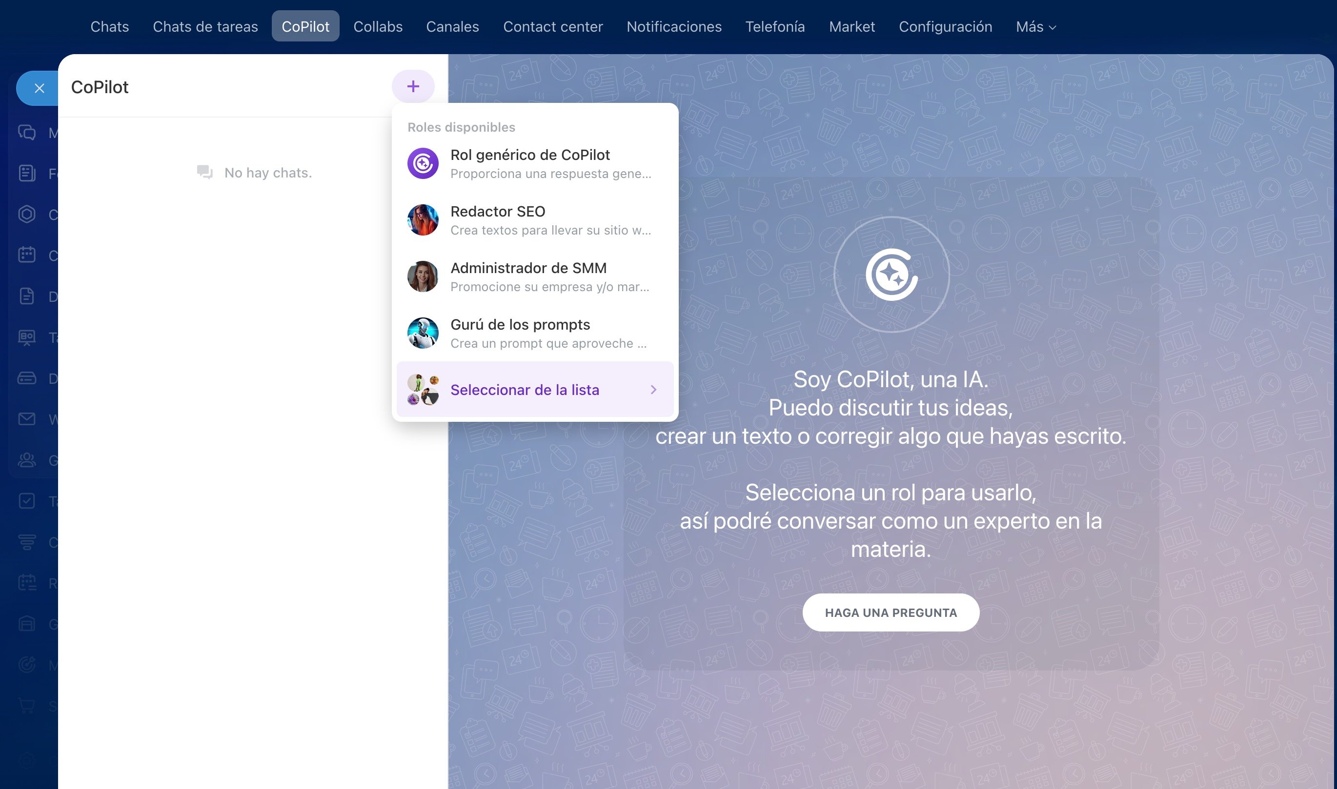 Antes de hacer una pregunta, selecciona el rol adecuado para CoPilot en el menú del chat. Esto define el tono y la profundidad de la respuesta. ¿No sabes qué rol elegir? Usa simplemente el CoPilot genérico. -