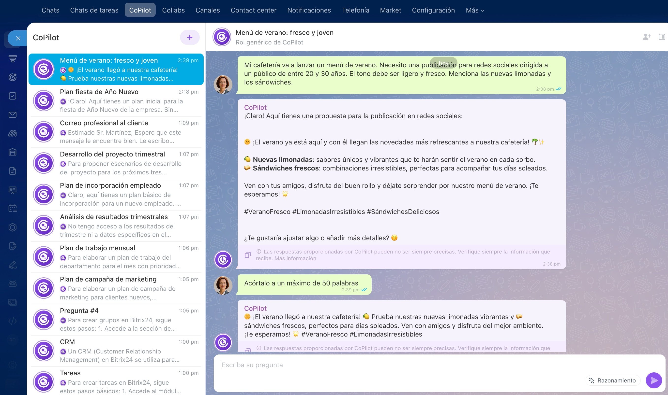 Dentro del chat, CoPilot recuerda los detalles de tu conversación desde el primer mensaje, así que puedes confiar en que mantendrá el contexto. -