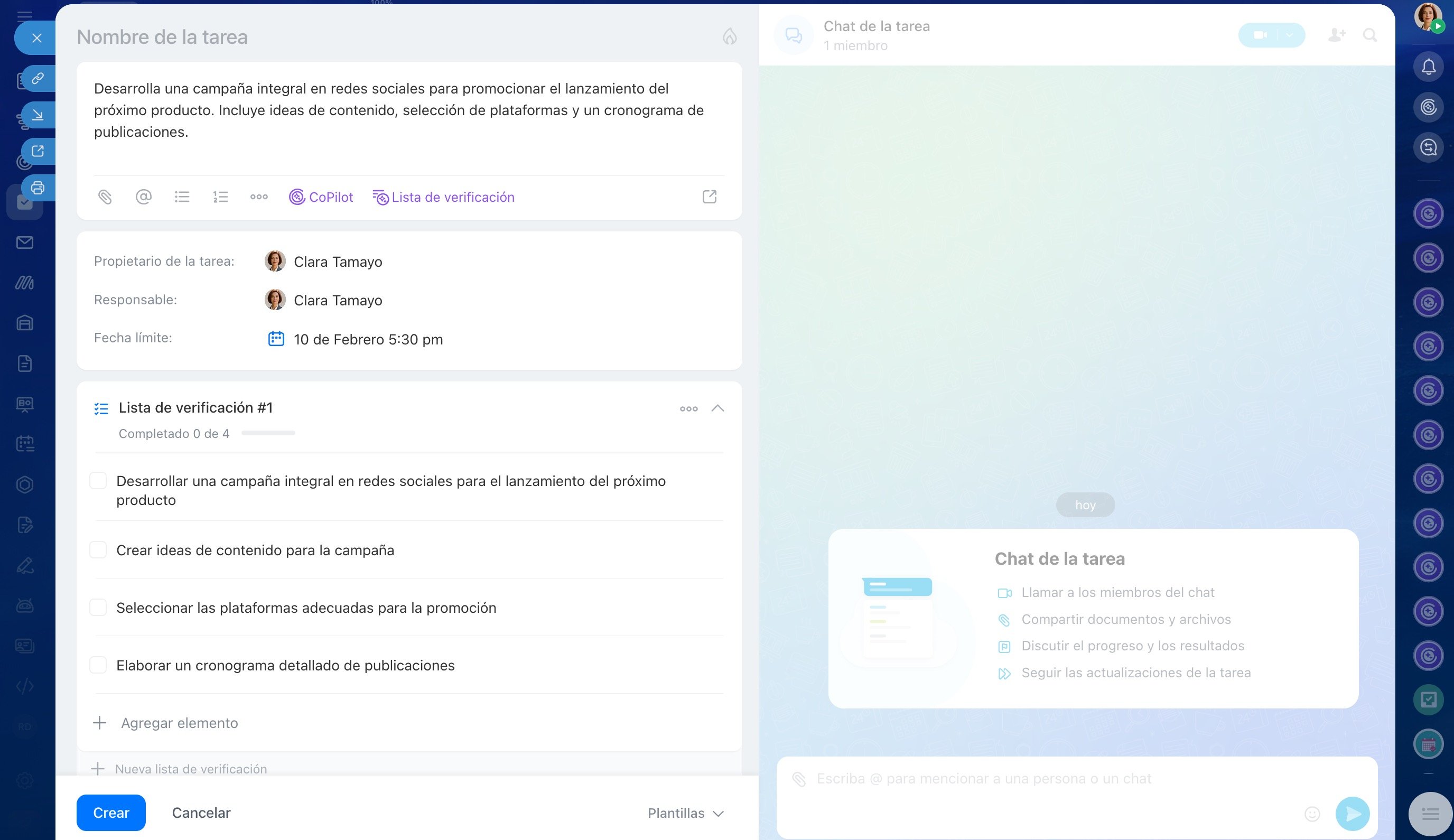 Supongamos que necesito crear 5 tareas, cada una con una descripción separada y una lista de verificación. Hacerlo manualmente probablemente me llevaría una hora; con CoPilot, solo unos 10 minutos. CoPilot descompone fácilmente tareas complejas en pasos lógicos: solo tengo que asignar a los responsables.