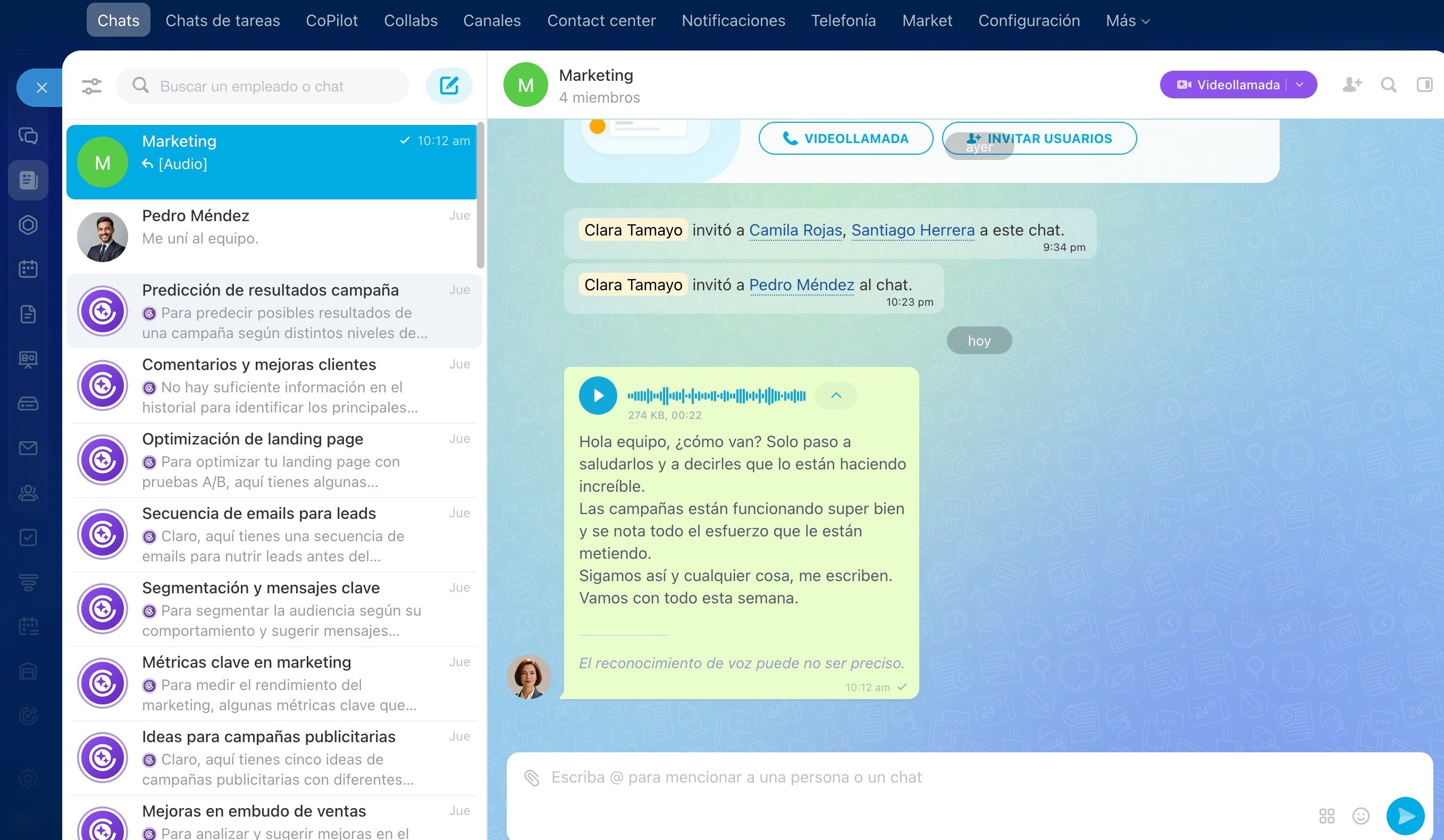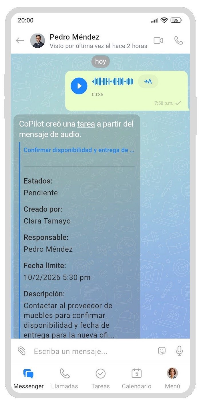Si utilizas muchos mensajes de voz, CoPilot también está aquí para ayudarte. Cualquier mensaje de voz enviado a un chat puede convertirse automáticamente en texto y/o tarea, según su contenido. Esto es lo que CoPilot puede hacer: