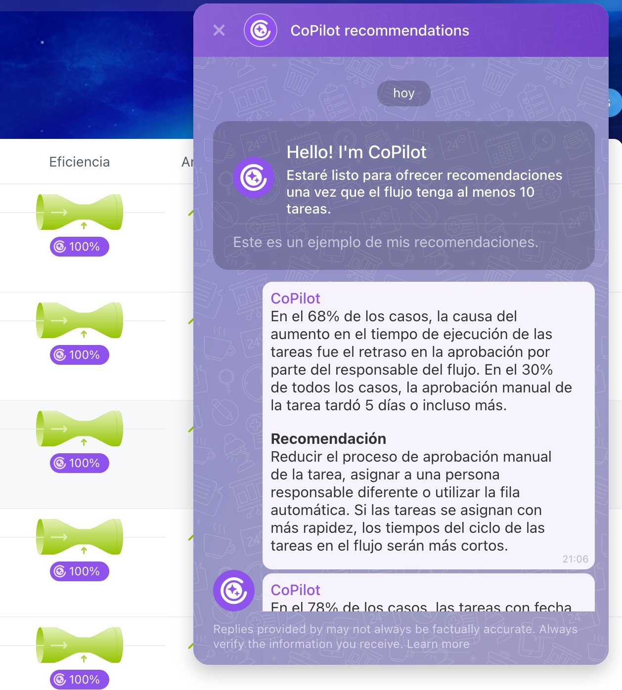 Si utilizas Flujos en tareas, CoPilot analizará un flujo seleccionado, identificará puntos débiles e ineficiencias y sugerirá mejoras. Si el equipo está rindiendo bien, CoPilot destacará lo que les ayuda a tener éxito.