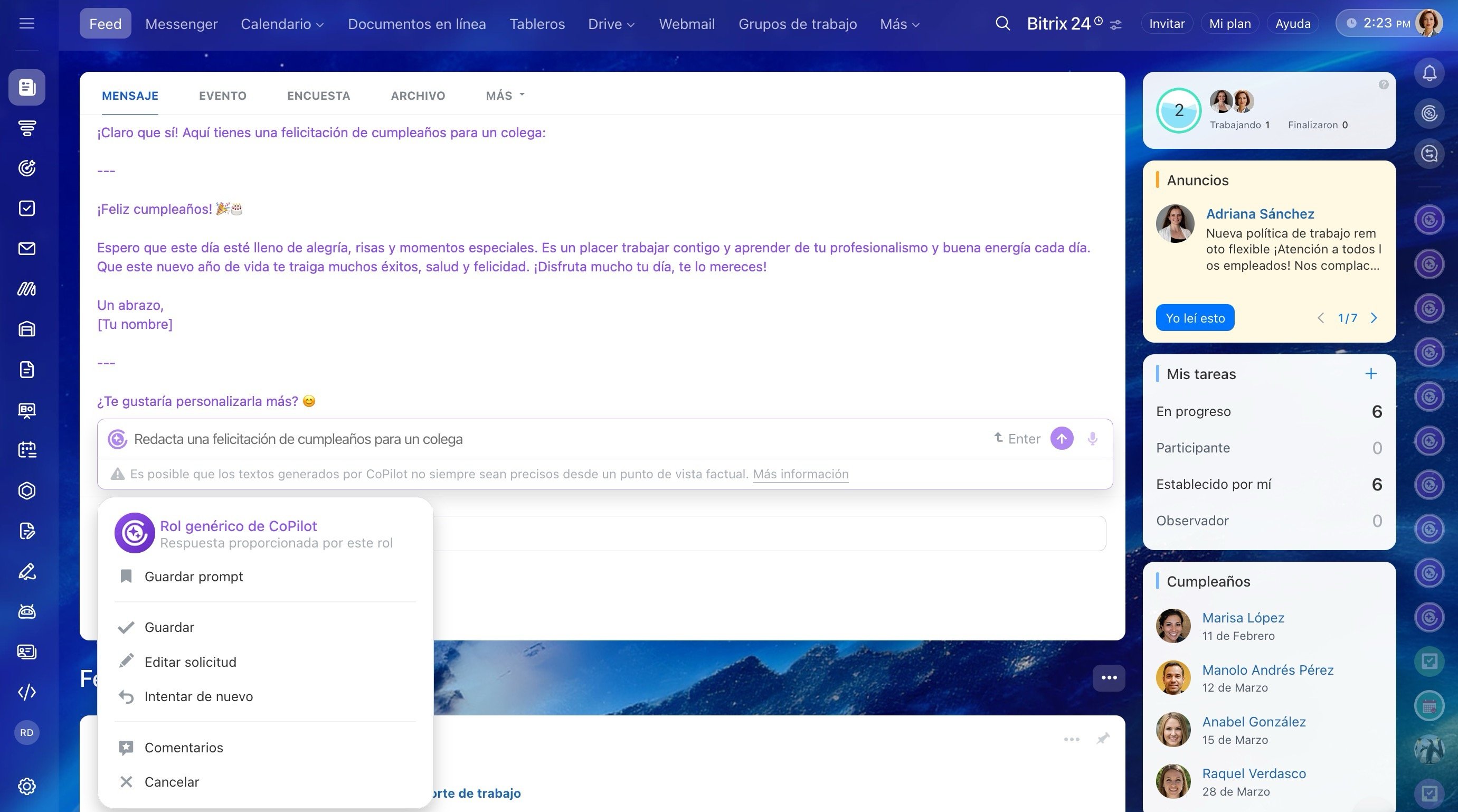 En el Feed de Bitrix24, CoPilot puede ayudarte a convertir un borrador en un mensaje completo o incluso redactar un anuncio en un estilo o tono específicos. También analiza las publicaciones de tu equipo: las resume, destaca los puntos clave, transforma bloques complejos en frases sencillas, traduce a varios idiomas y más.