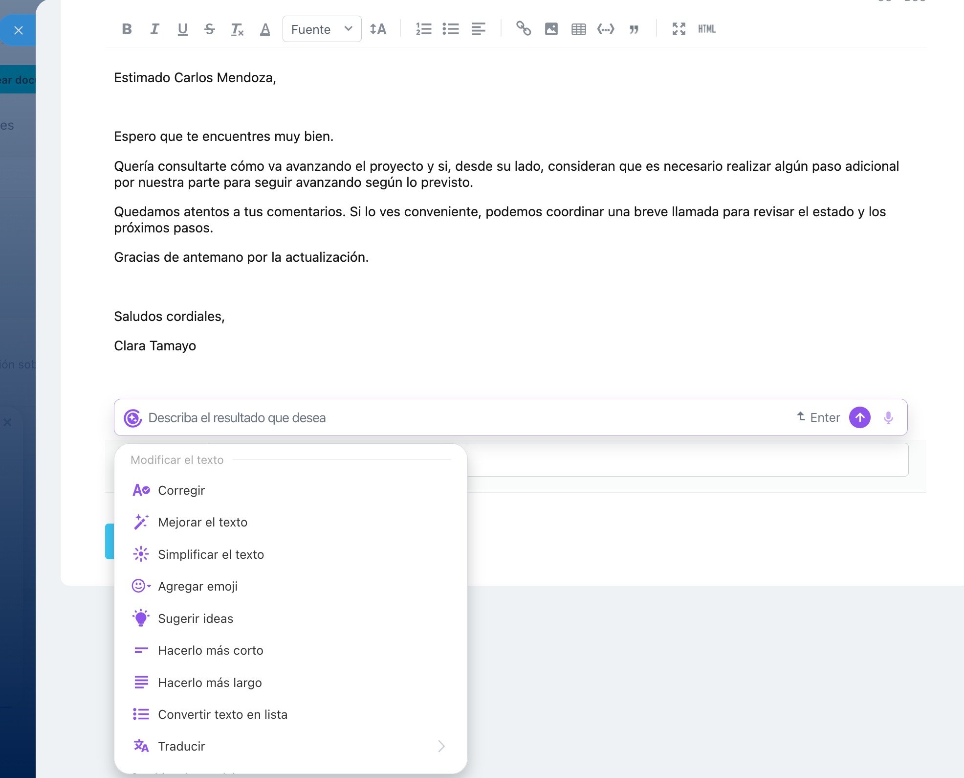 Aquí puedes usar CoPilot para redactar y responder correos de clientes, acortar o ampliar textos existentes, preparar propuestas y mucho más. Estas funciones están disponibles en la sección "Webmail" del menú principal y también en el CRM.