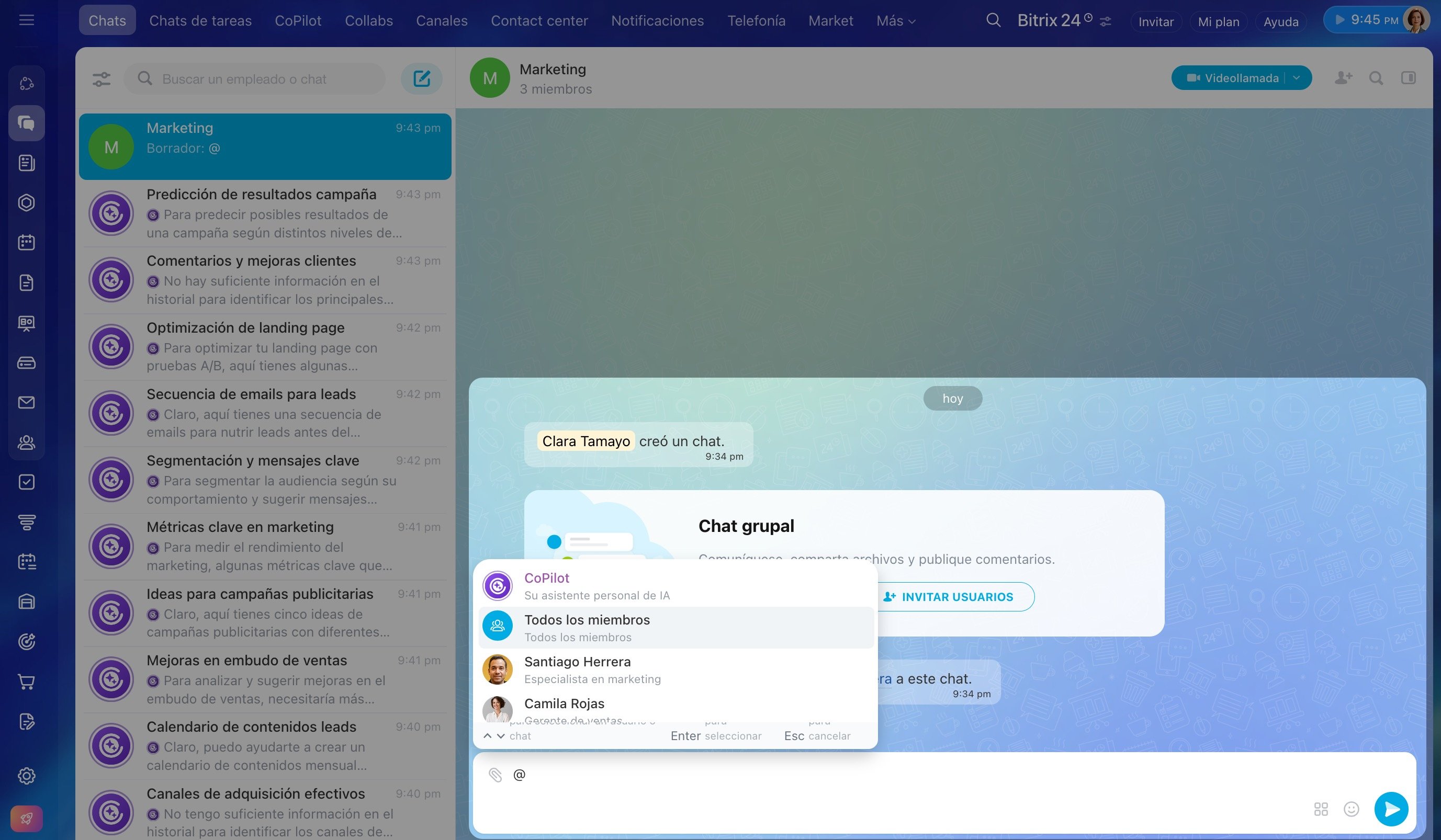 Interactúa con CoPilot directamente dentro de tus chats grupales o privados en Bitrix24 Messenger. Esto es especialmente útil cuando necesitas ponerte al día después de vacaciones o una baja médica, resumir una discusión larga o incorporar a un nuevo miembro del equipo.
