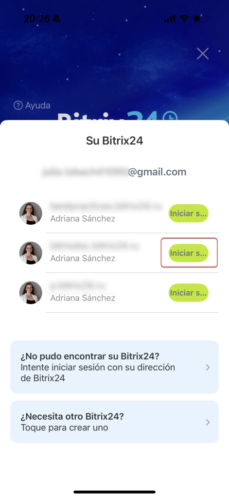 Si tienes varias cuentas de Bitrix24, elige una para iniciar sesión en ella.
