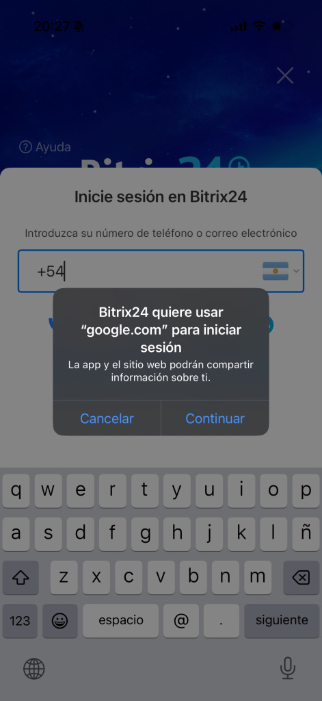 Google, Facebook, Apple ID. Toca el icono del servicio vinculado a su cuenta de Bitrix24. Permite el acceso a su cuenta e inicie sesión.