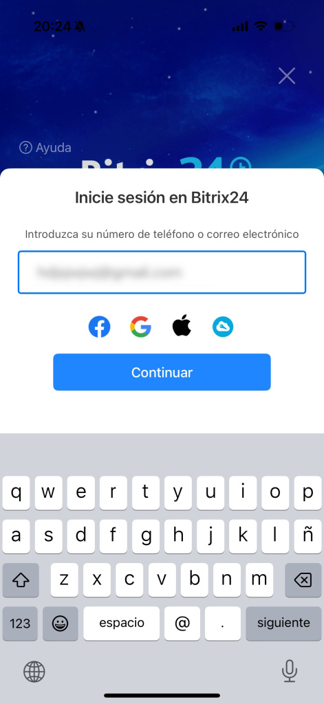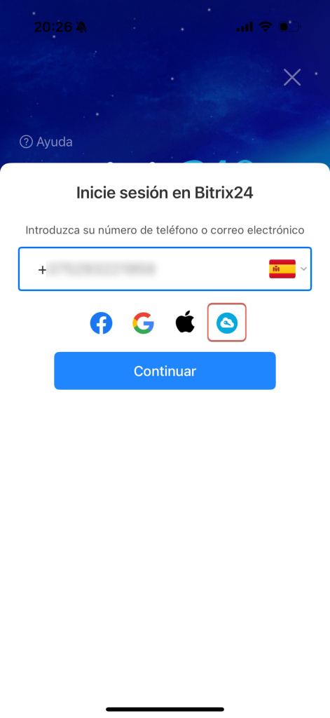 En Bitrix24 Nube, nombre de usuario es tu dirección de correo electrónico o número de teléfono. Si te has registrado en Bitrix24 a través de una red social, toca el icono apropiado para iniciar sesión.