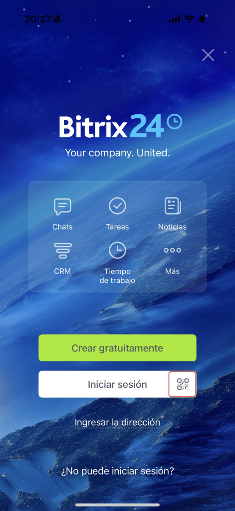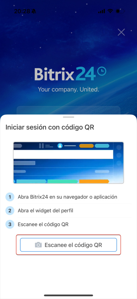 Código QR. Si ya has iniciado sesión en la versión web de Bitrix24, puede ingresar a la aplicación móvil utilizando el código QR. En la versión web, haz clic en tu foto de perfil > Iniciar sesión por teléfono.