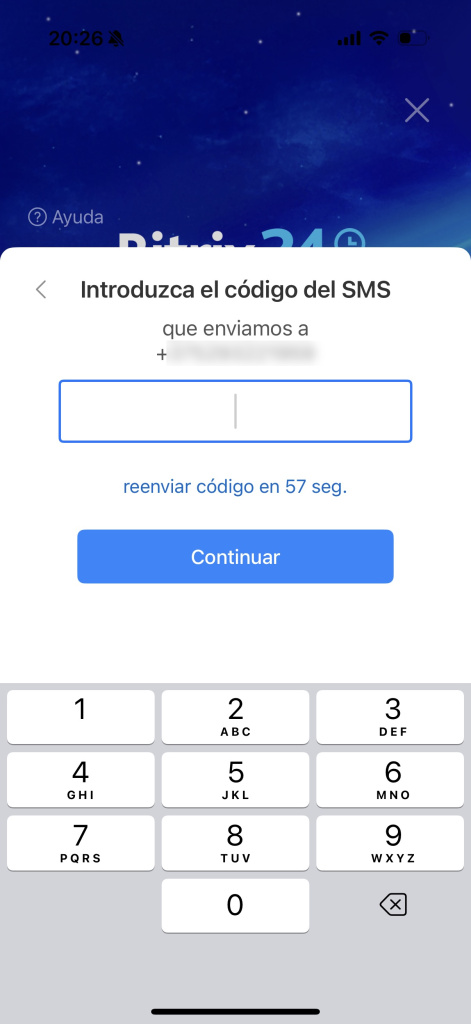 Número de teléfono. Ingresa tu número de teléfono y Bitrix24 te enviará un SMS con el código de verificación.