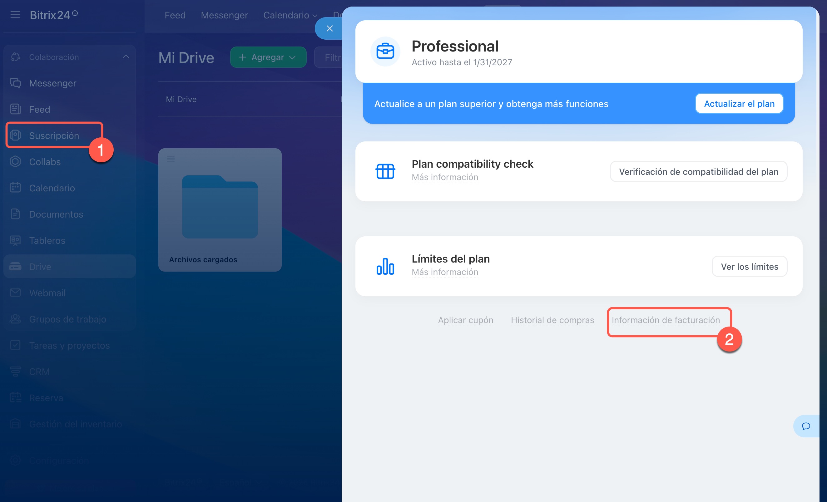 Para actualizar tus datos de pago o facturación, accede a Suscripción > Información de facturación.