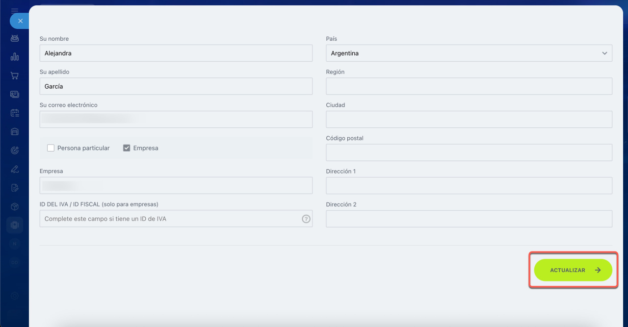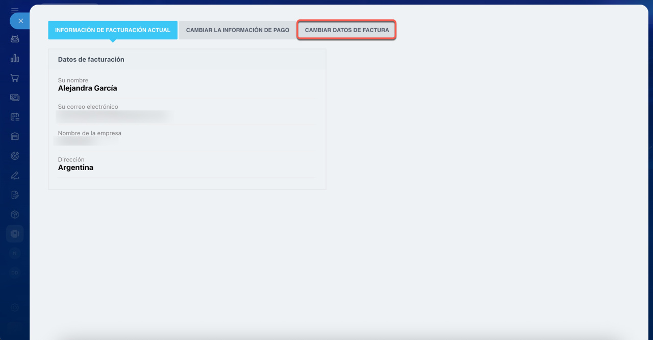 Cambiar los datos de facturación. Para actualizar tus datos de facturación, abre la pestaña correspondiente. Completa el formulario y haz clic en Actualizar.