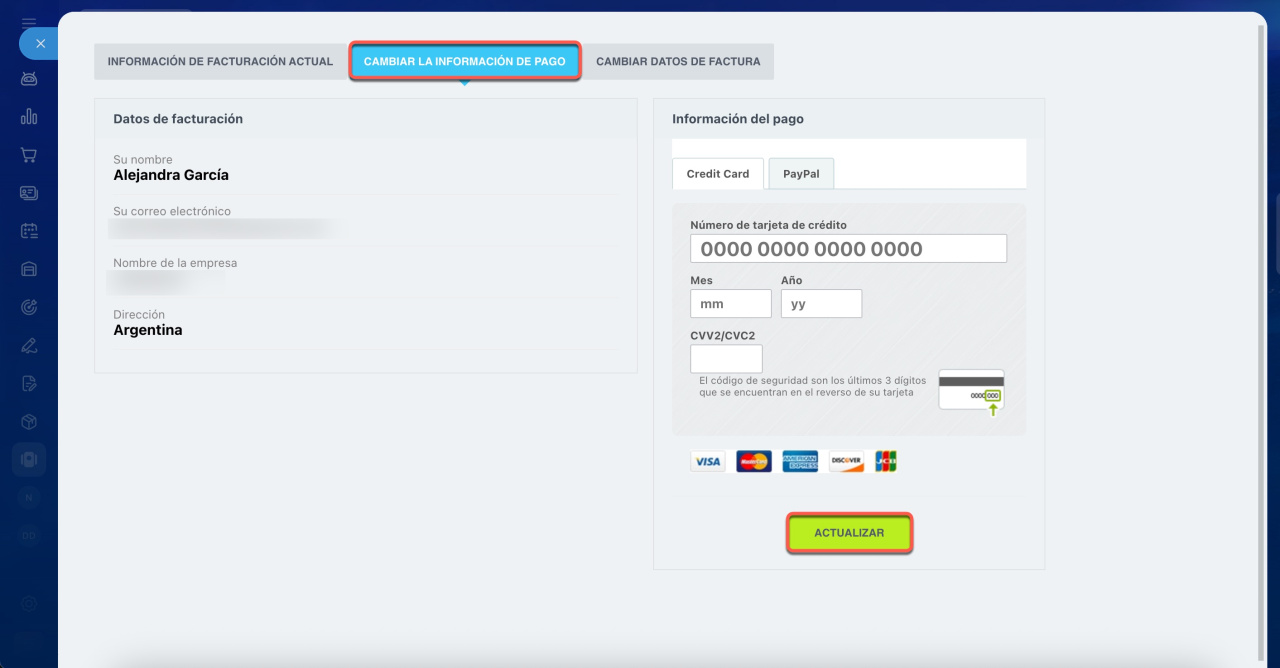 Cambiar la información de pago. Para actualizar tu información de pago (tarjeta de crédito o PayPal), abre la pestaña correspondiente. Ingresa los nuevos detalles y haz clic en Actualizar.
