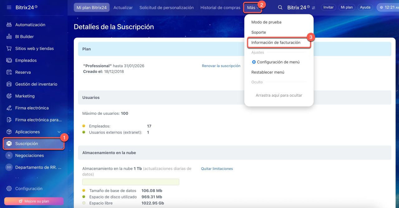 Para actualizar tus datos de pago o facturación, accede a Suscripción > Más > Información de facturación.