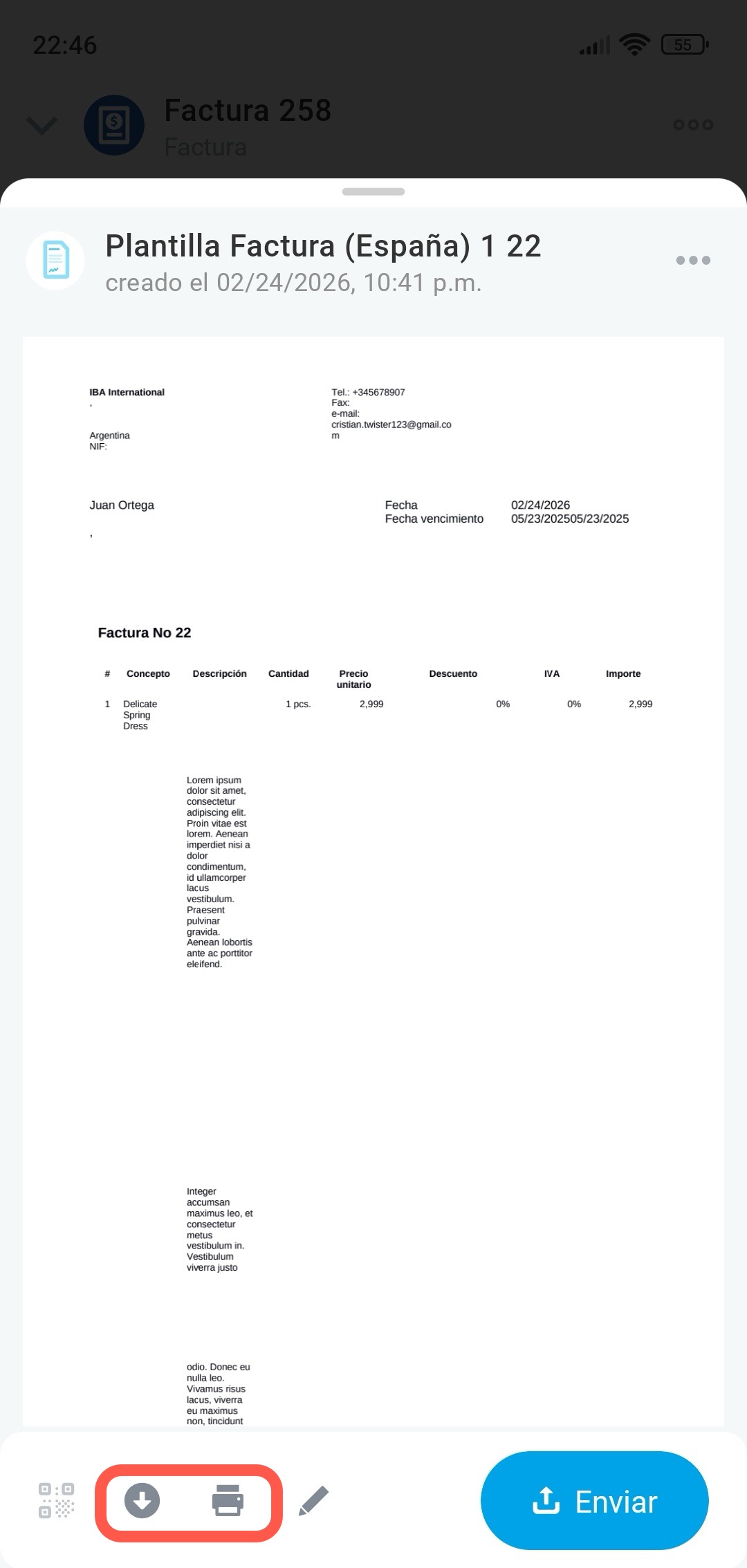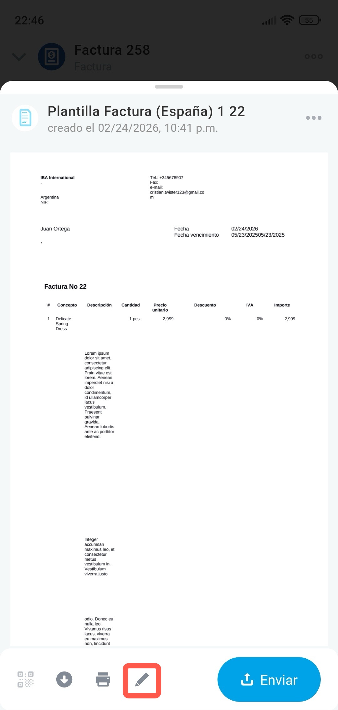 Si después de crear el documento necesitas hacer cambios, toca el lápiz del panel inferior, por ejemplo, para modificar los datos de la empresa.
