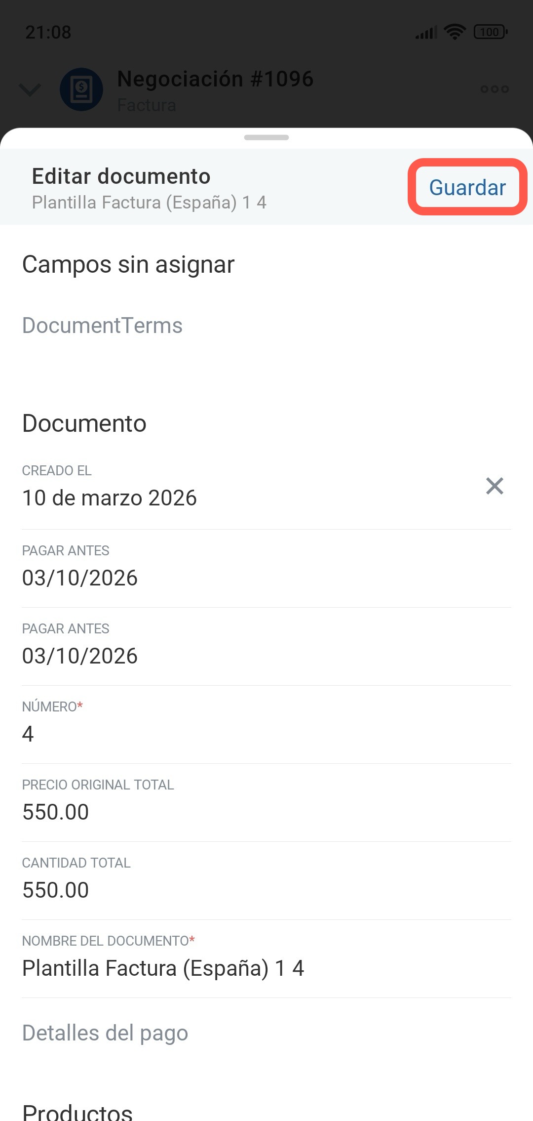 En el CRM móvil puedes crear documentos a partir de plantillas, como facturas, contratos o cotizaciones.