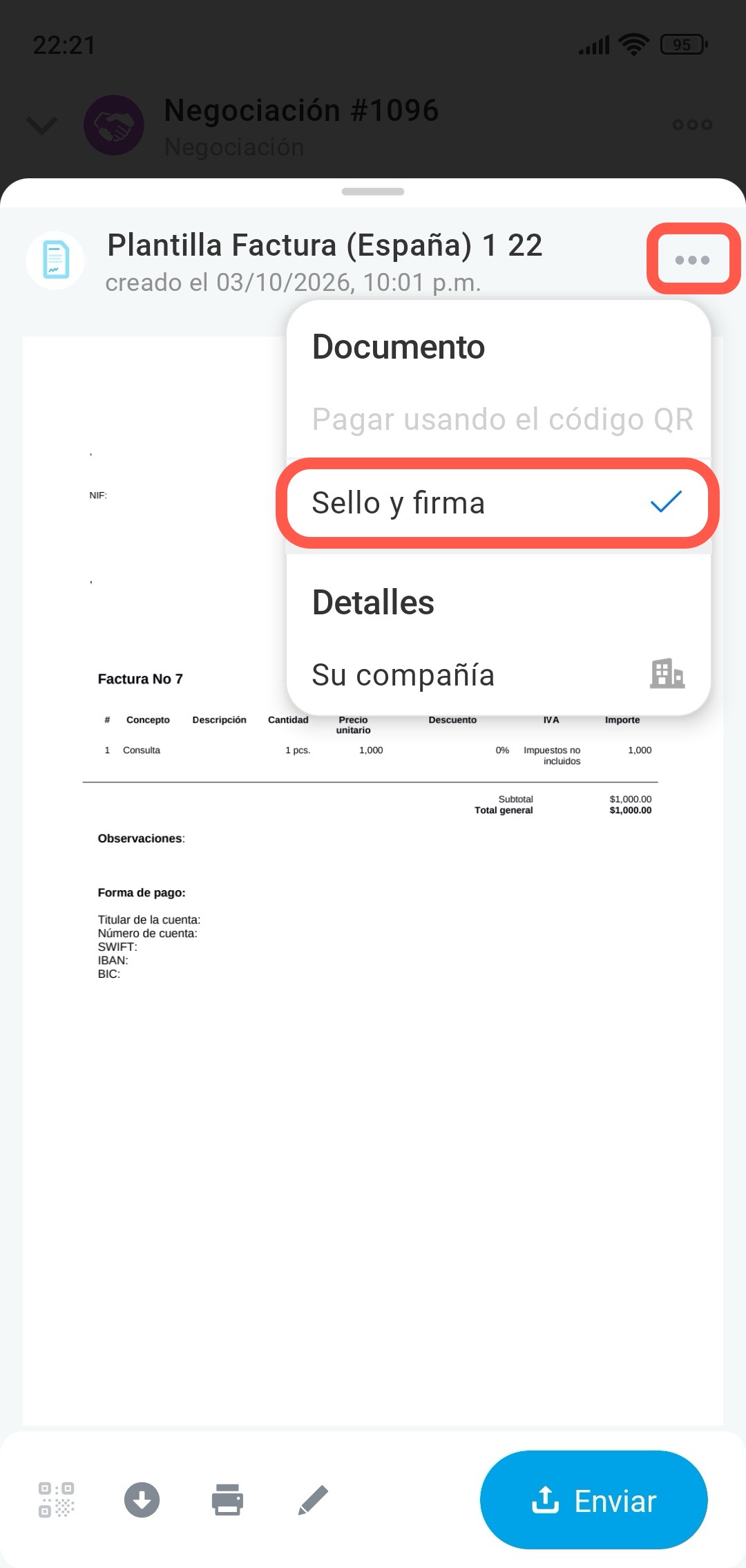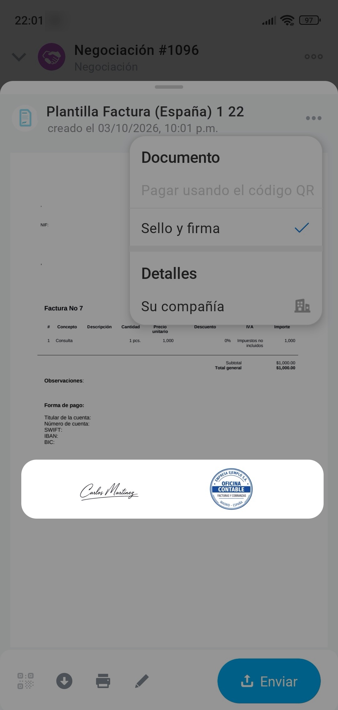 Para enviar el documento al cliente, toca Enviar.