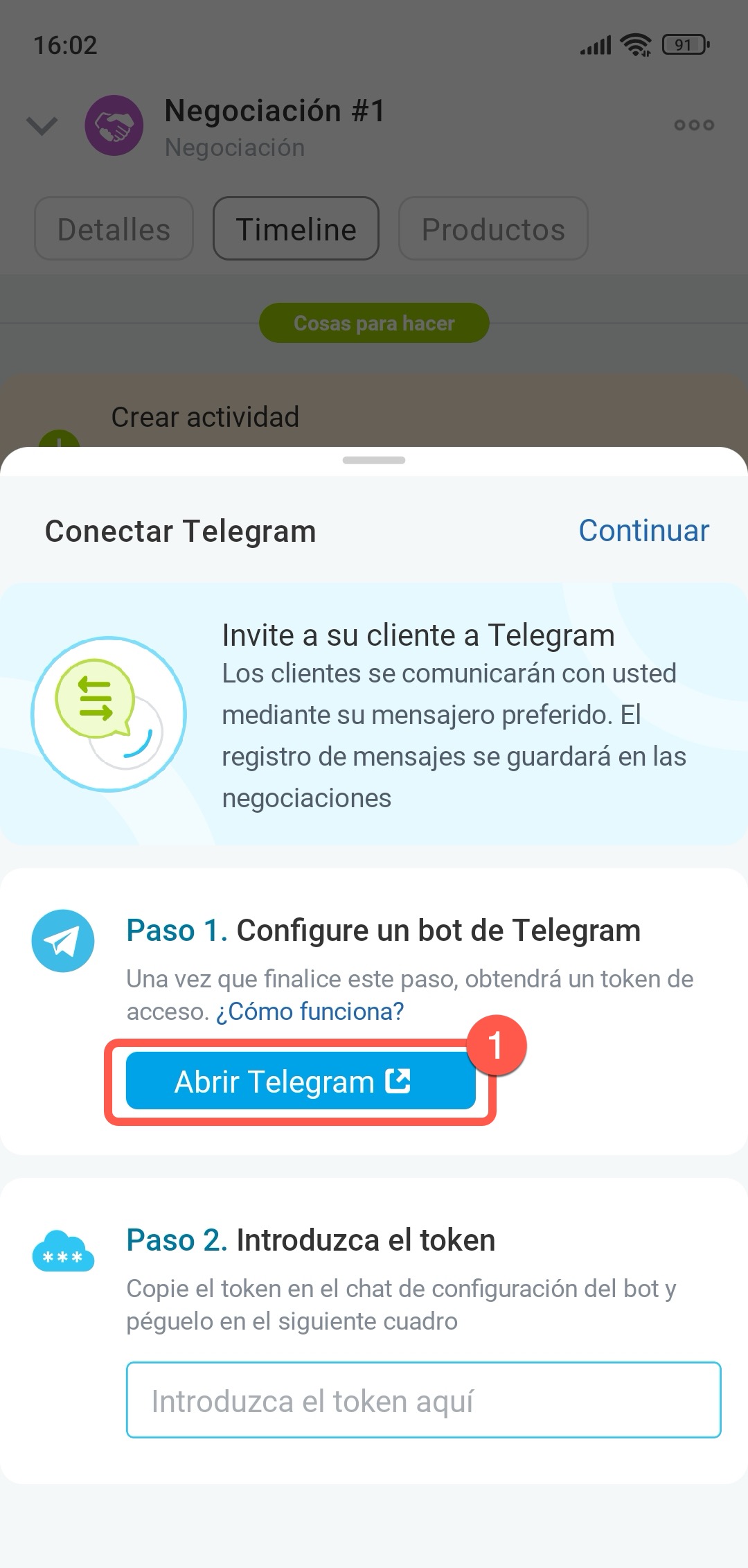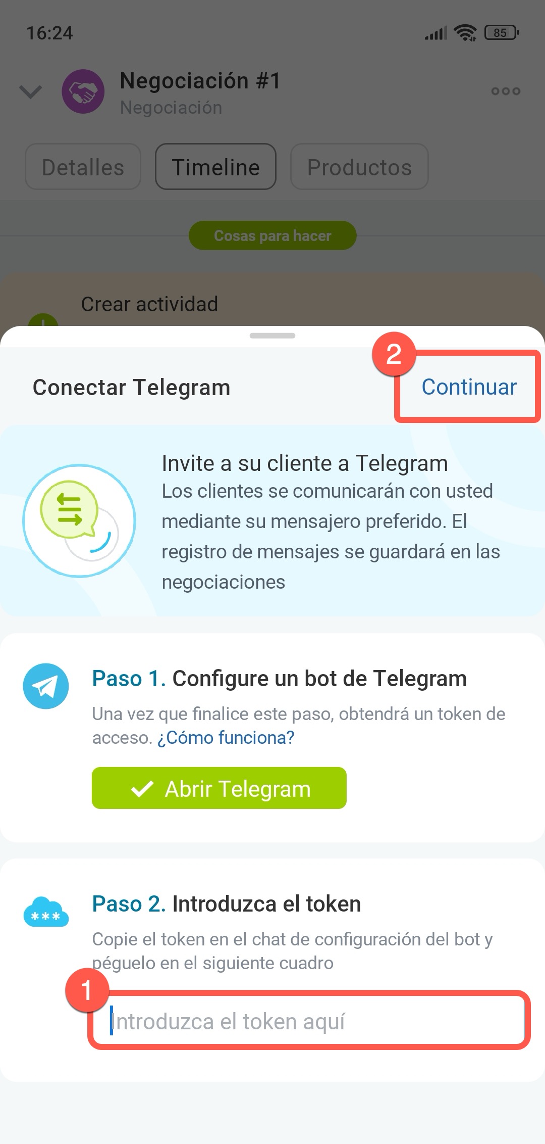 1–2. Pega el token en el campo Paso 2 y toca Continuar. Telegram se conectará a la última línea abierta que hayas creado. Puedes seleccionar otra línea en la versión web de Bitrix24.
