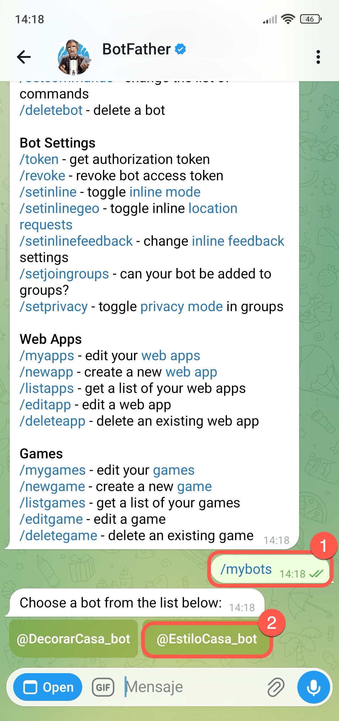 1–2. Escribe el comando /mybots y selecciona el bot.