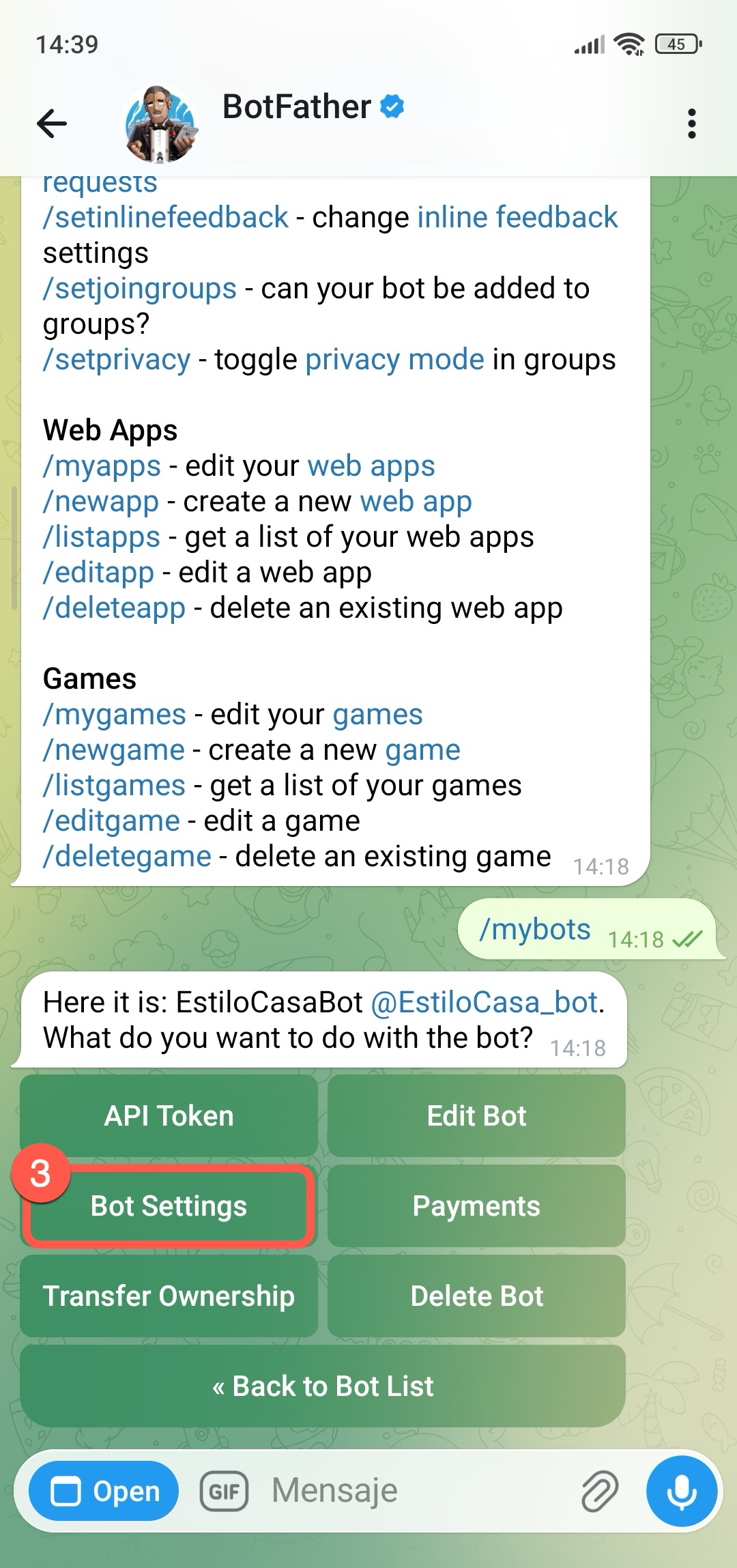 3. Toca Bot Settings para acceder a la configuración del bot.