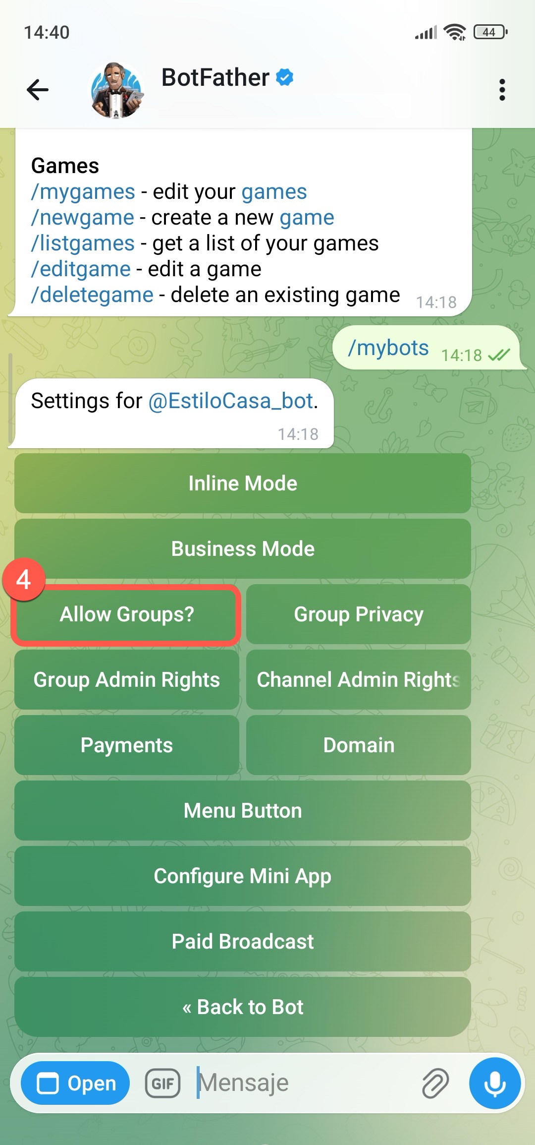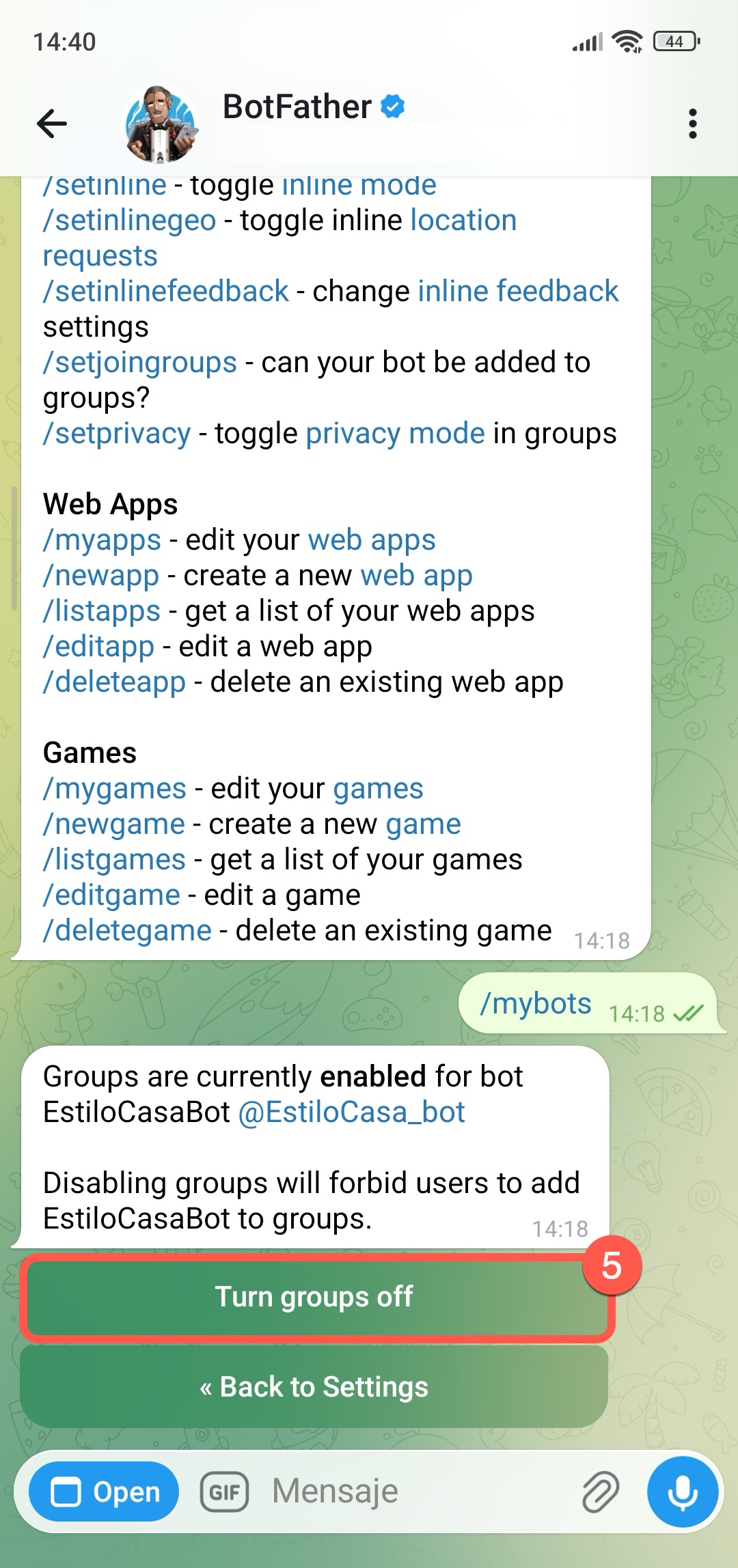 5. Toca Turn groups off. Ahora no se podrá añadir el bot a grupos.