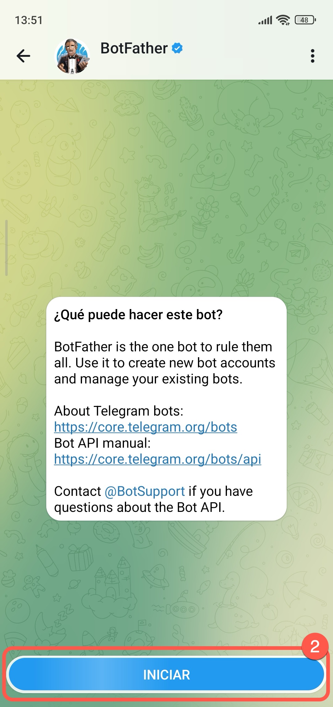 2. Se abrirá la aplicación de Telegram y el chat con el bot @BotFather, que crea bots y genera tokens. Toca Iniciar.