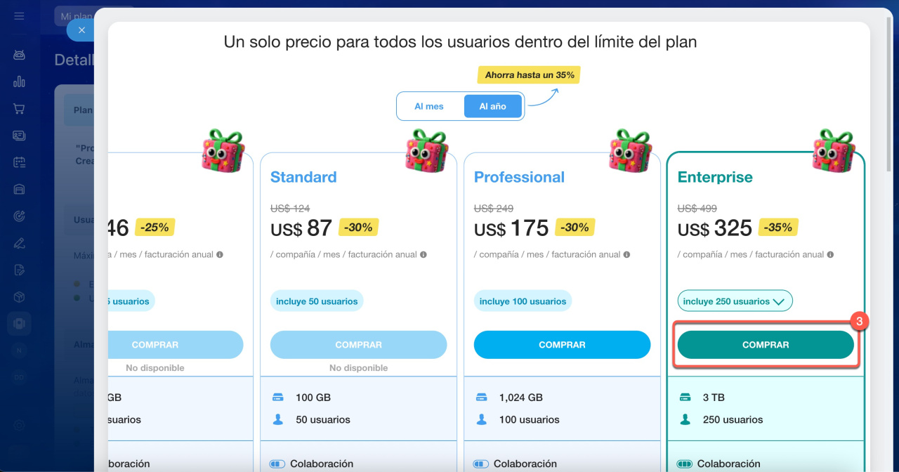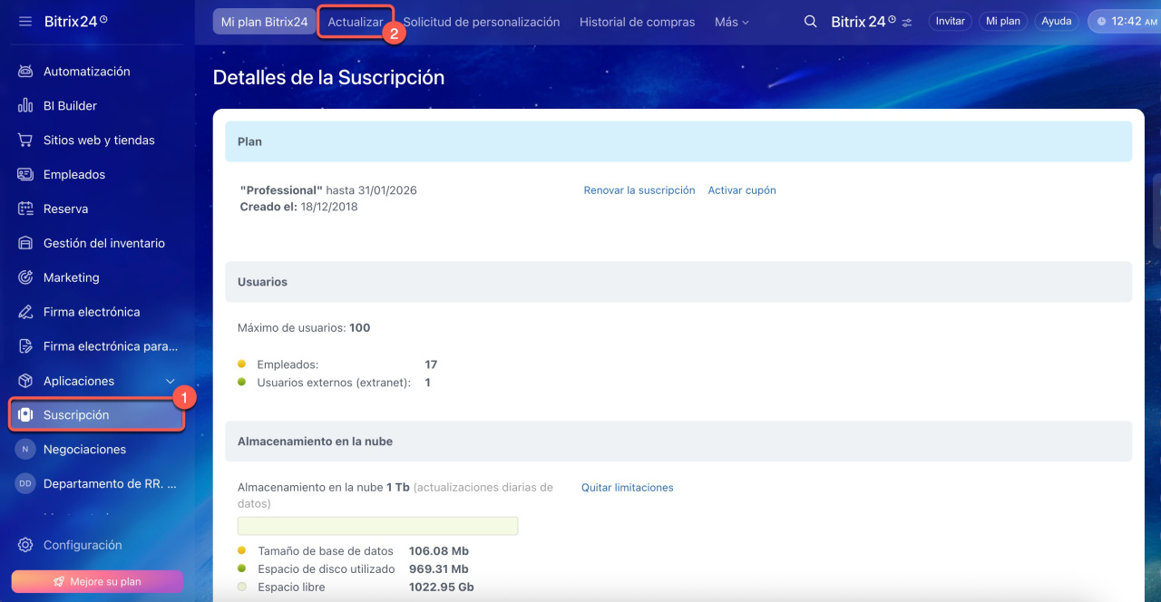 En tu cuenta de Bitrix24, accede a Suscripción > Actualizar. Selecciona el plan que más te convenga.