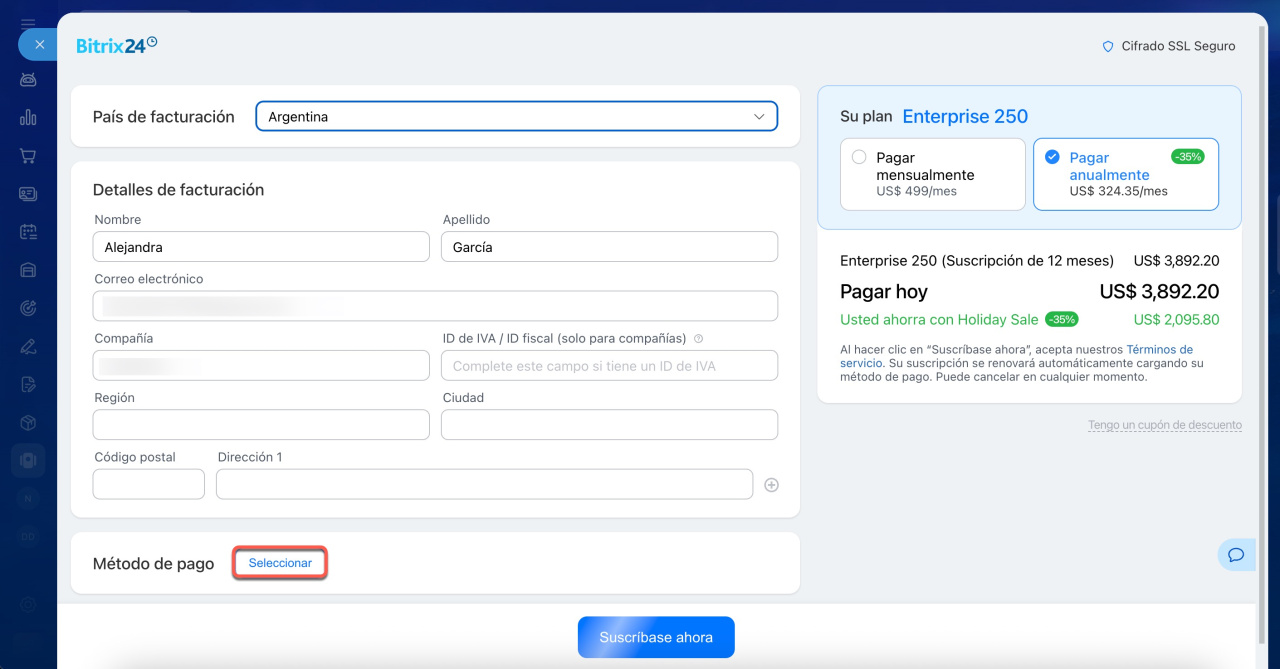 Elige tu método de pago y completa tus datos. Asegúrate de seleccionar el plan de suscripción y el período de facturación deseados, y de que el precio total coincida con lo que esperabas. Haz clic en Suscribirse ahora para finalizar tu pedido.