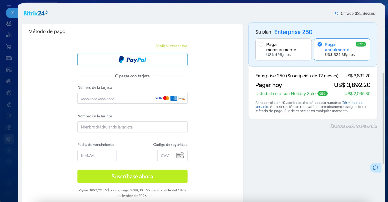 Tras la confirmación del pago, tu cuenta de Bitrix24 se activará automáticamente con la suscripción comprada.