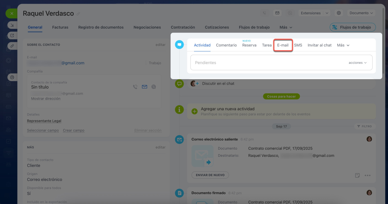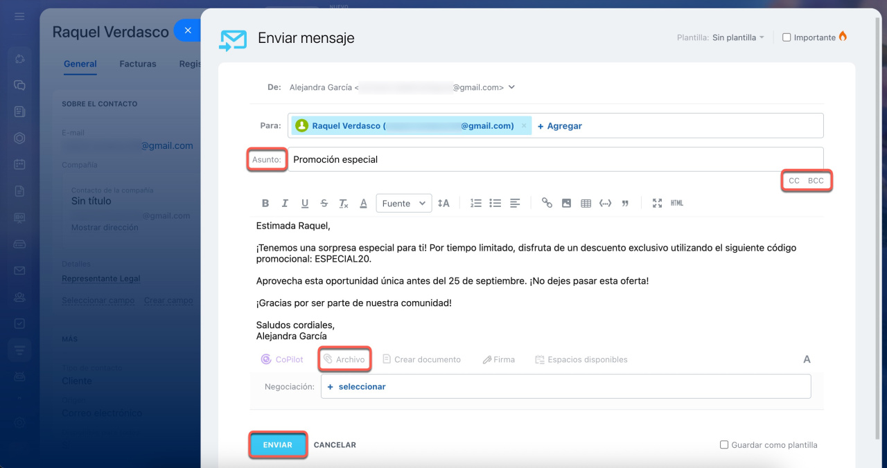 - En CRM, puedes leer y enviar correos electrónicos, así como adjuntarles archivos.