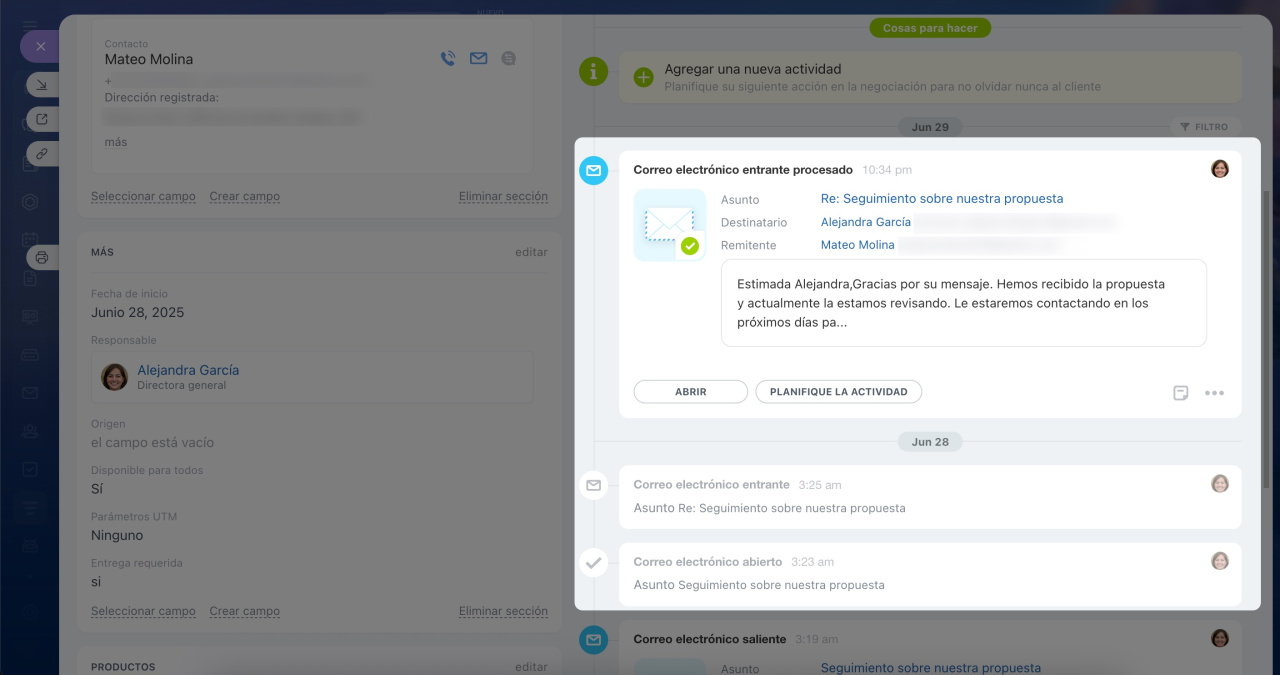Si habilitas la opción Integración de CRM en la configuración de tu buzón, los correos electrónicos entrantes aparecerán en la ficha del elemento de CRM correspondiente.