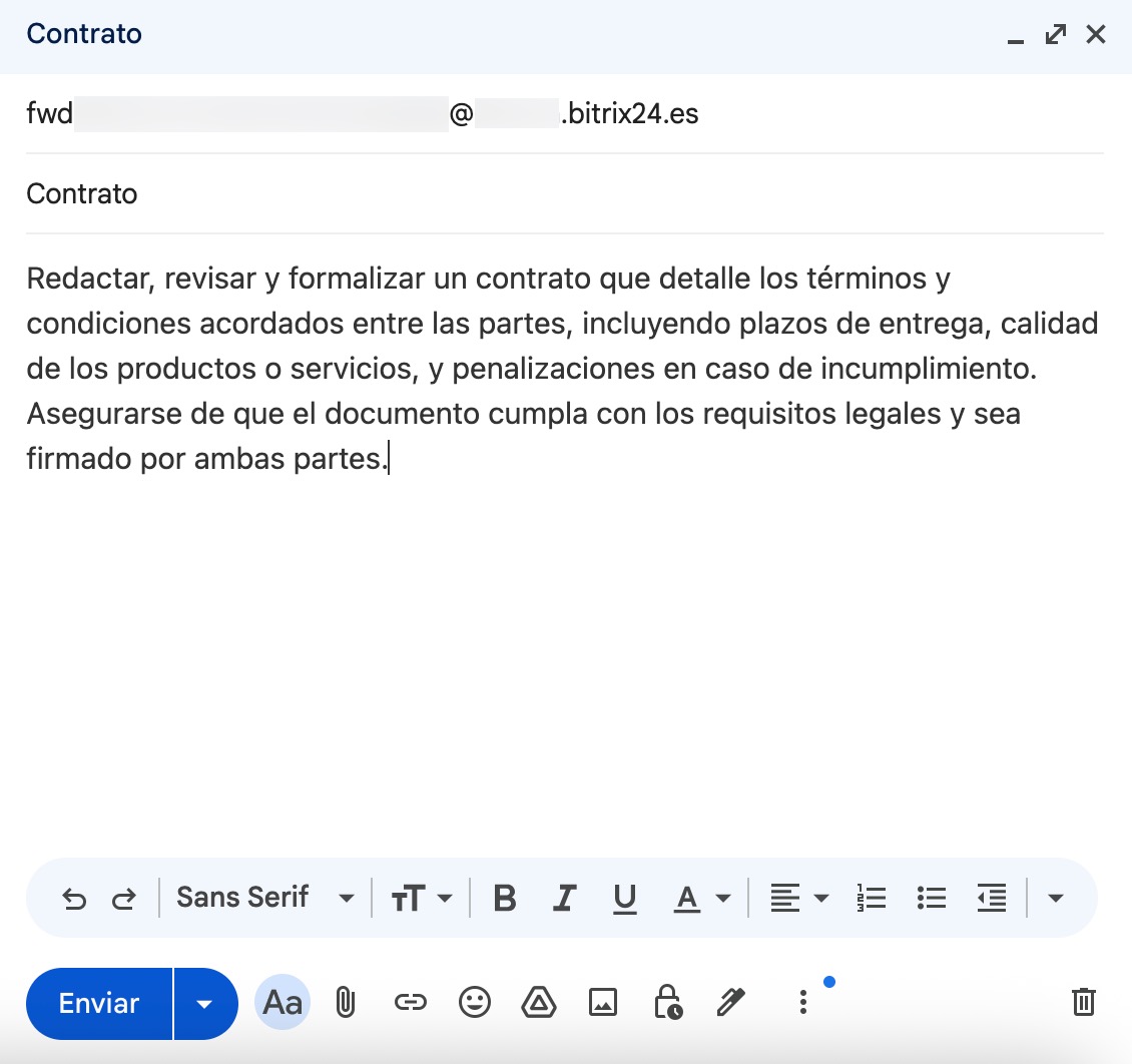 Para recibir tareas de usuarios externos en Bitrix24, estos deben enviar un correo electrónico a la dirección especificada. Pueden adjuntar archivos de hasta 14 MB al correo.