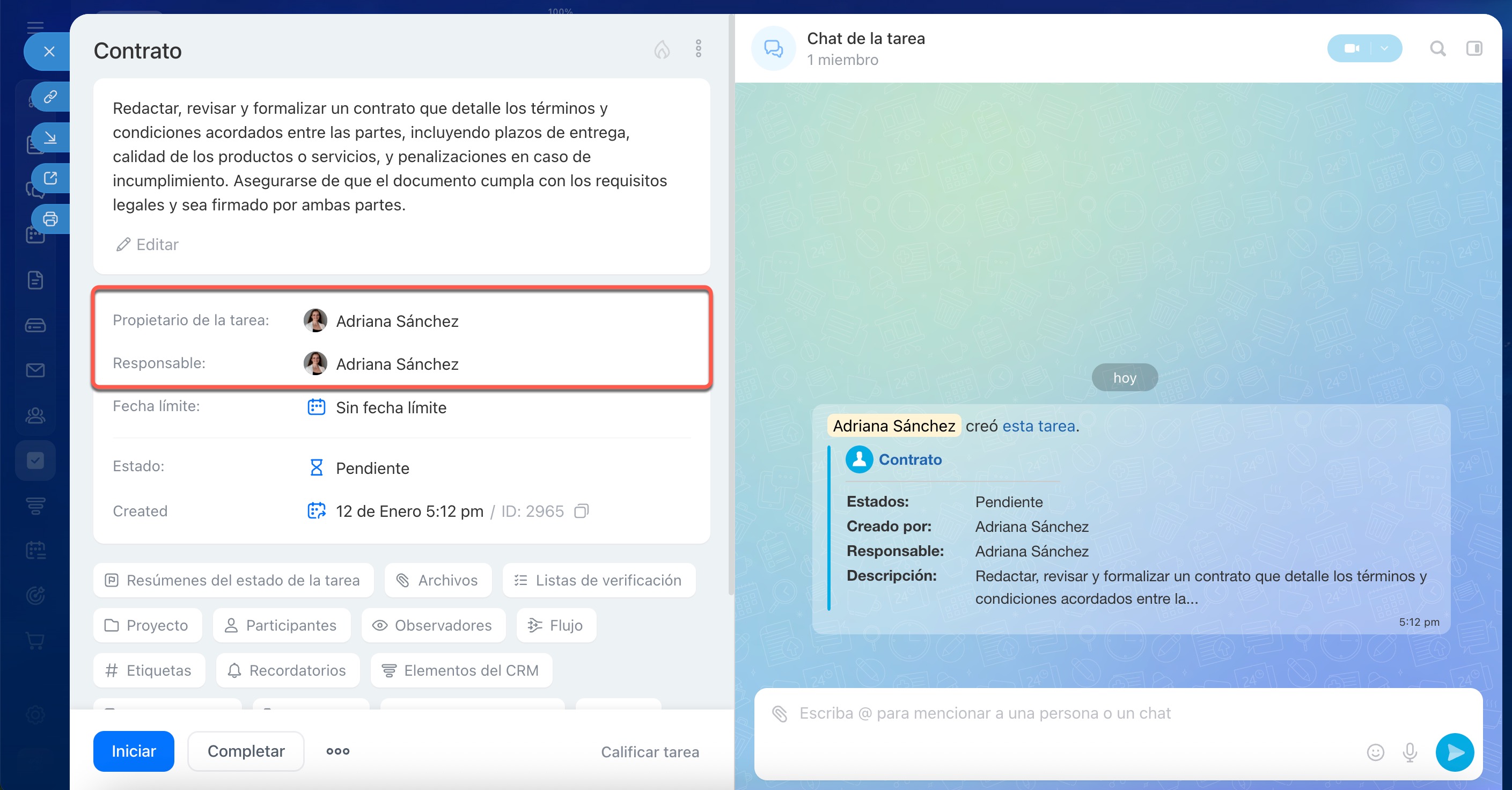Una vez enviado el correo electrónico, la tarea aparecerá en tu Bitrix24. Por defecto, el empleado de cuyo perfil se copió el enlace será el creador y el responsable de la tarea. Los roles de los usuarios se pueden cambiar.
