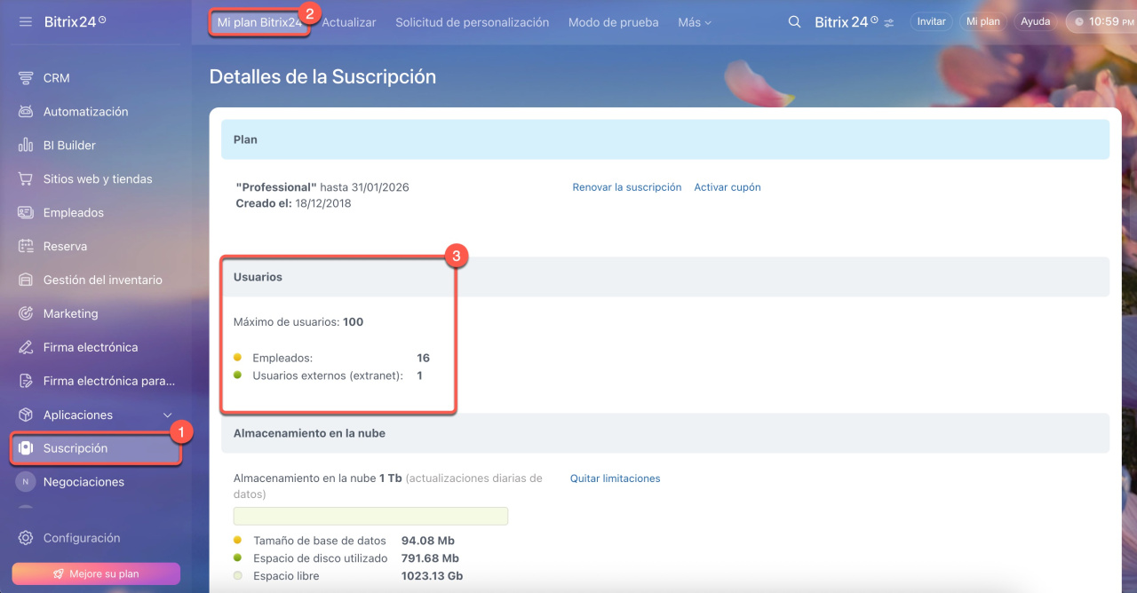 Puedes encontrar el número de usuarios disponibles en tu plan en la sección de Suscripción > Mi plan Bitrix24 > Usuarios.