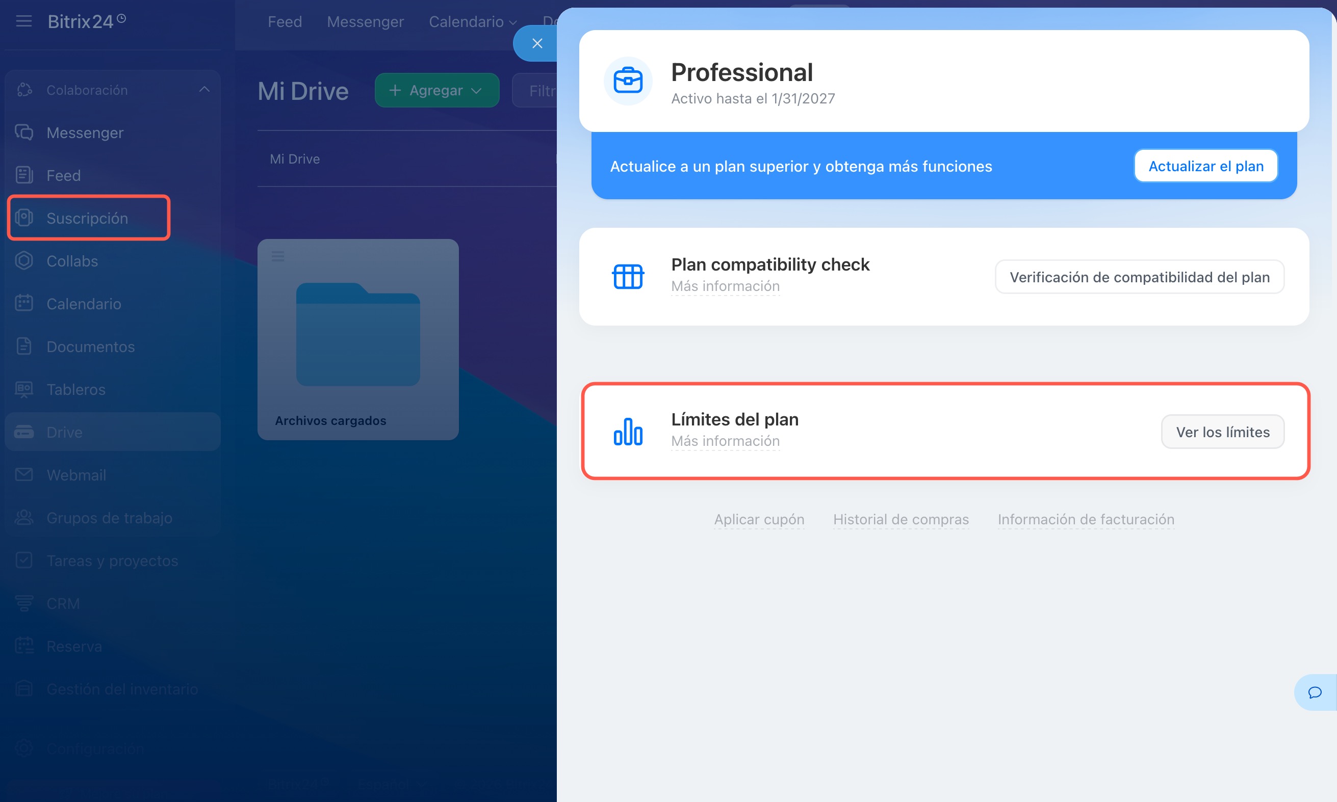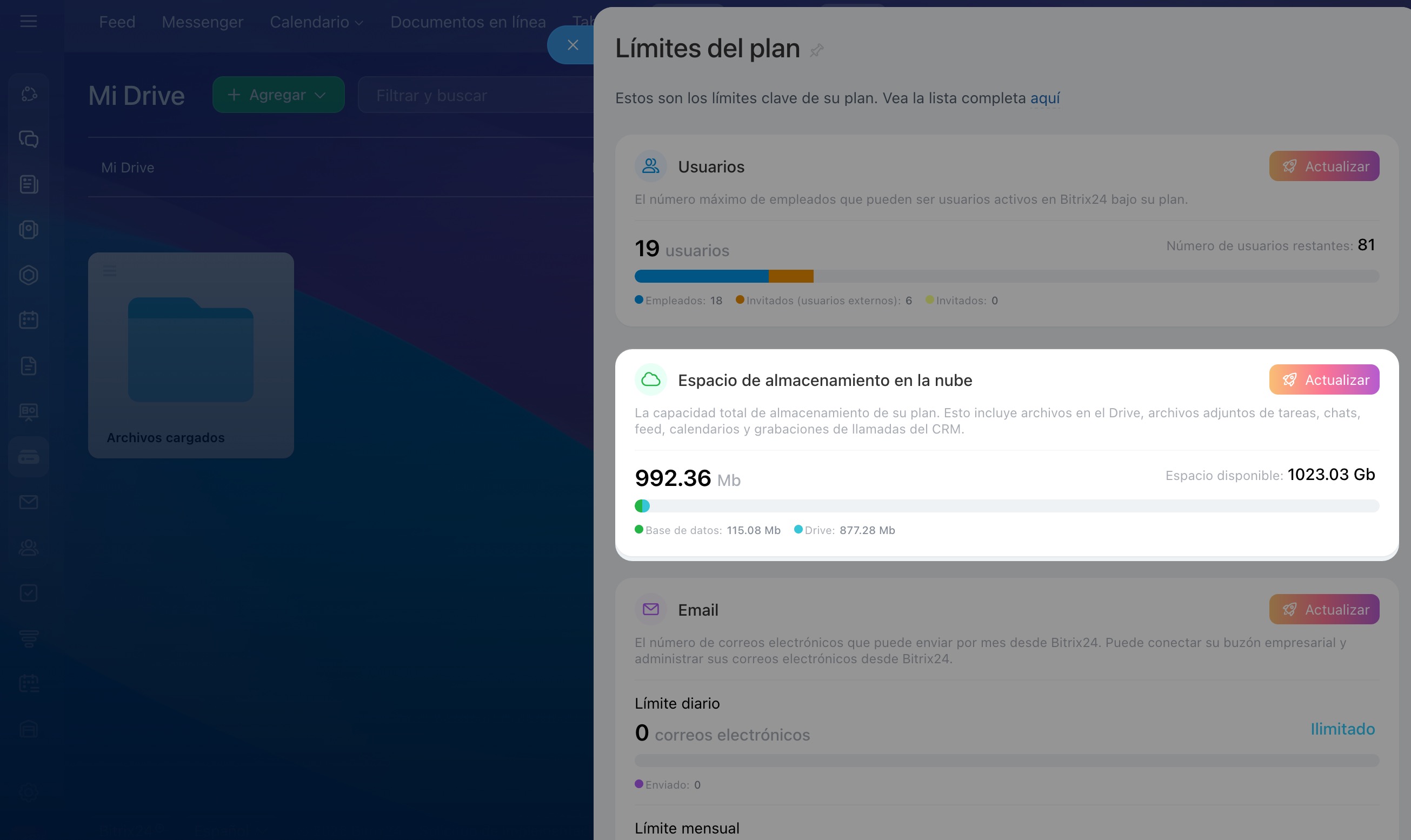 El espacio de almacenamiento en su cuenta depende de su plan de Bitrix24. Una vez agotado el espacio libre, no podrá cargar nuevos archivos.