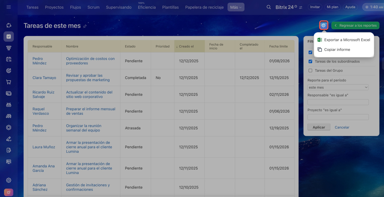 Abre el reporte y haz clic en el icono Configuración (⚙️) para exportar el reporte a Microsoft Excel o eliminarlo.