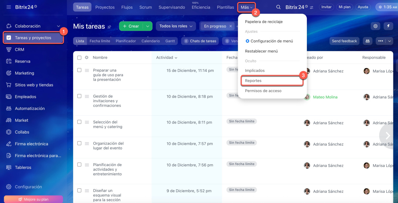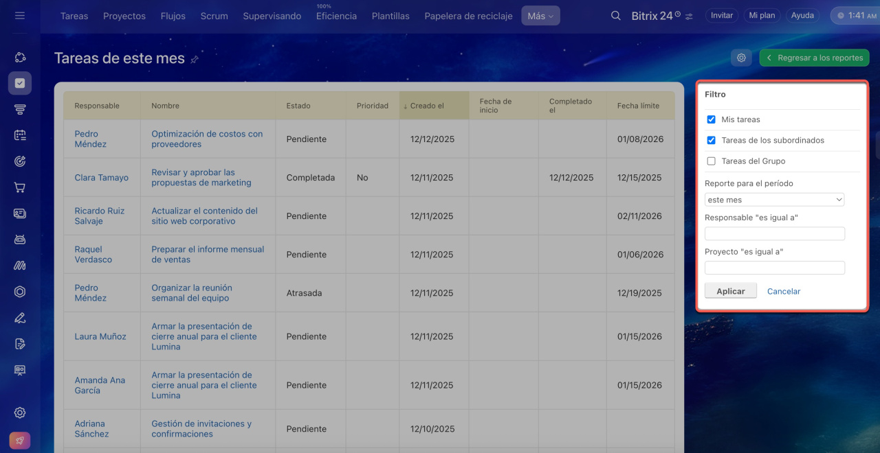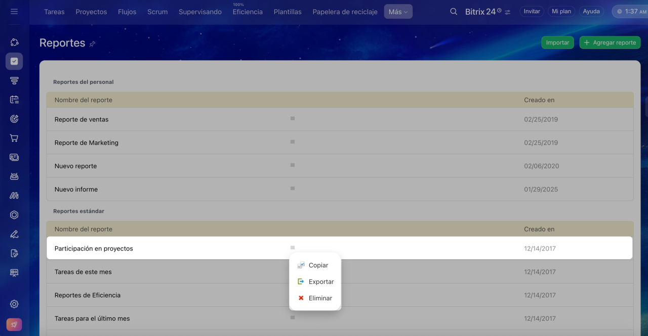 Los reportes de tareas te permiten realizar un seguimiento de la carga de trabajo y analizar la eficiencia de los empleados. En Bitrix24, hay dos tipos de reportes: personales y estándar. En este artículo, vamos a considerar los reportes estándar.