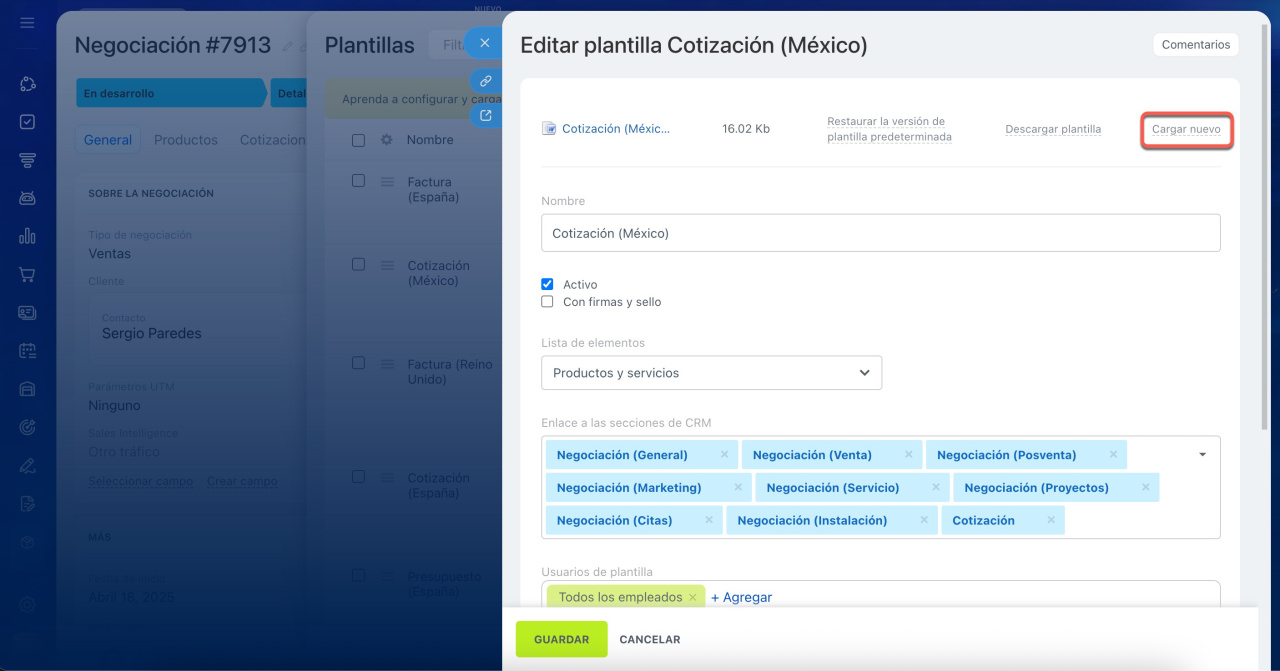 Sustituye la plantilla antigua por una nueva haciendo clic en Cargar nuevo. Cambia la configuración: nombre, permisos de acceso y vinculación a los elementos de CRM.
