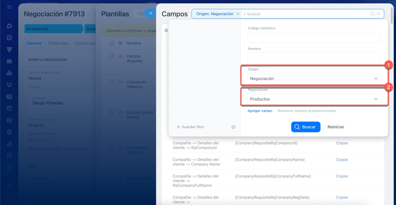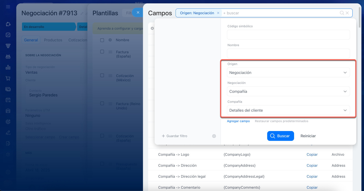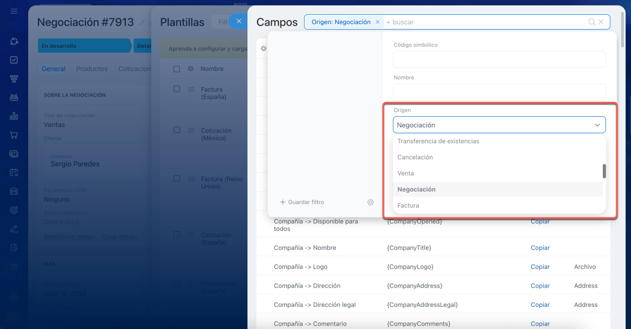 Consideremos un ejemplo. Supongamos que necesitas encontrar el código de los detalles del cliente. Dado que el documento se crea a partir de una negociación, selecciónala en el campo Origen. Si el cliente está guardado en Bitrix24 como una compañía, selecciónala en el campo Negociación. A continuación, selecciona Detalles del cliente.