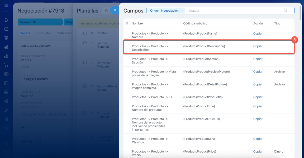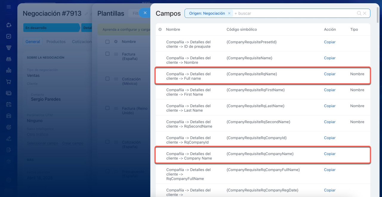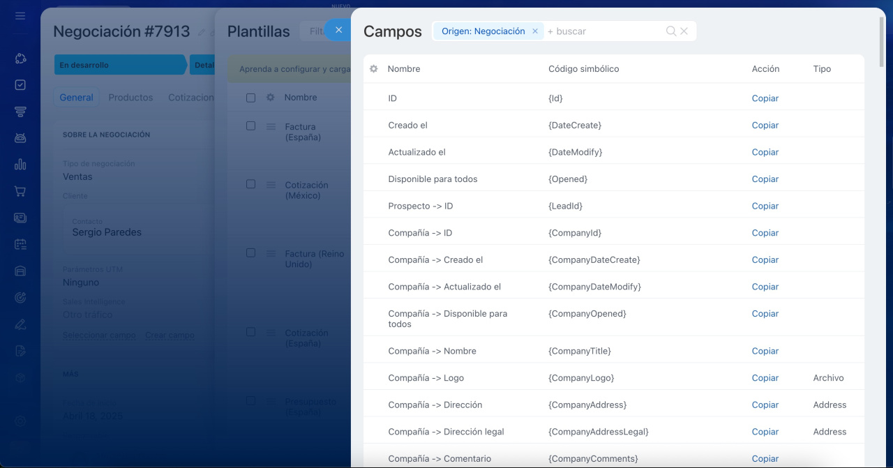 Los códigos simbólicos se utilizan para que el CRM encuentre el campo requerido en la ficha del elemento y lo inserte automáticamente en la plantilla de documento. No necesitas buscar los datos manualmente, ya que Bitrix24 lo hará por ti.