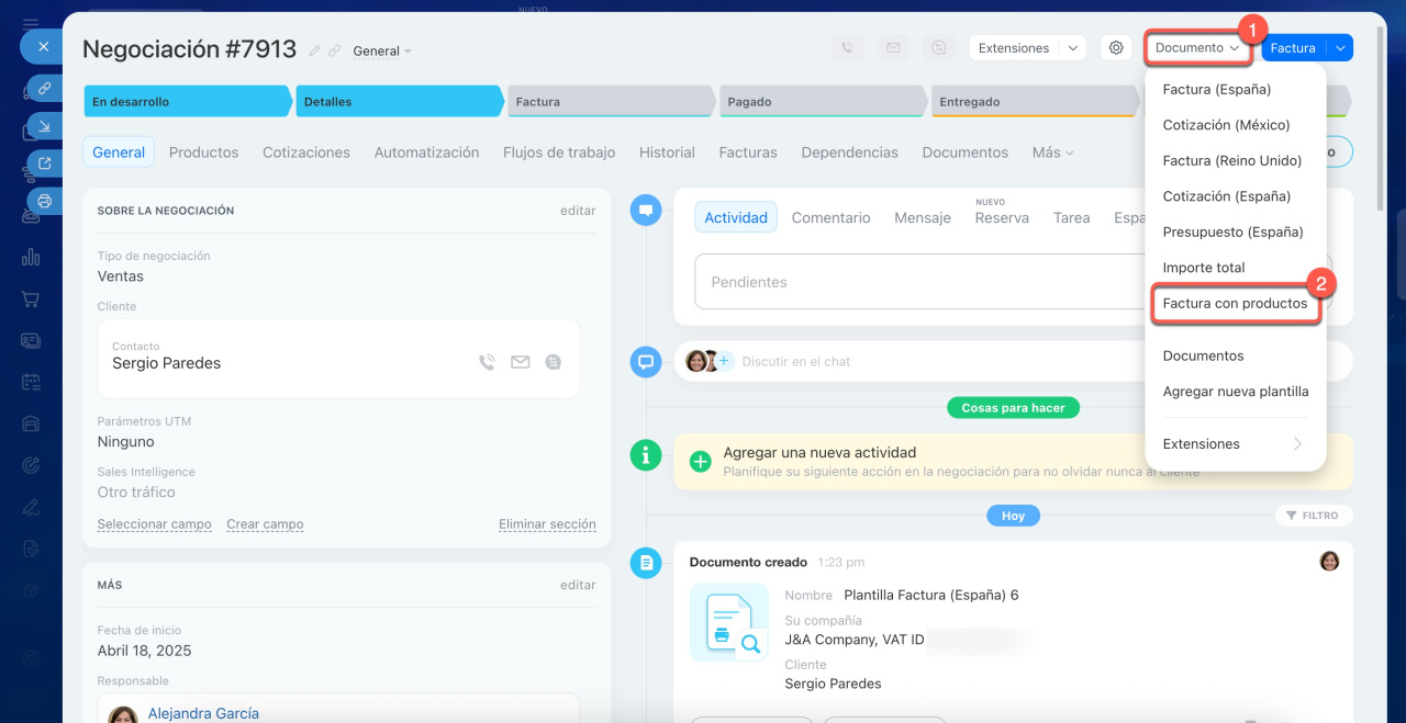 - Bitrix24 tiene un conjunto de plantillas de documentos estándar. Puedes personalizarlas para insertar automáticamente los detalles necesarios.