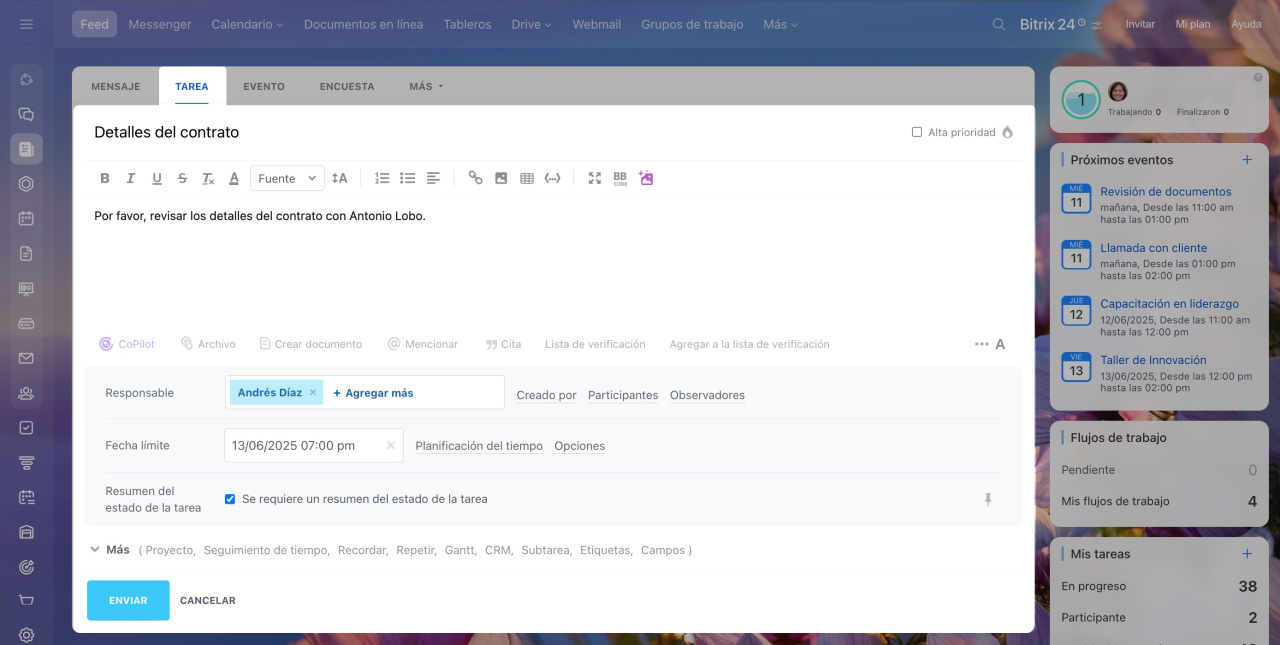 Feed en Bitrix24 es un espacio para compartir información y crear comunicación en vivo entre los empleados de tu empresa. Incluye: