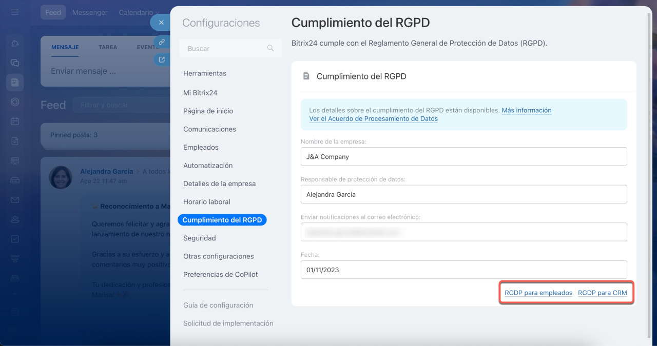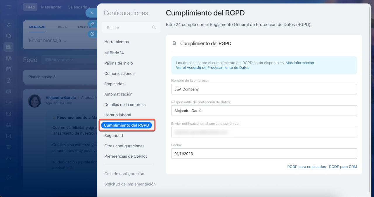 Como Bitrix24 tiene muchos clientes en la Unión Europea, seguimos las reglas de cumplimiento del RGPD y mantenemos la sección RGPD en nuestro sitio web. Aceptas tu Acuerdo de procesamiento de datos como parte de nuestros principales términos de servicio.