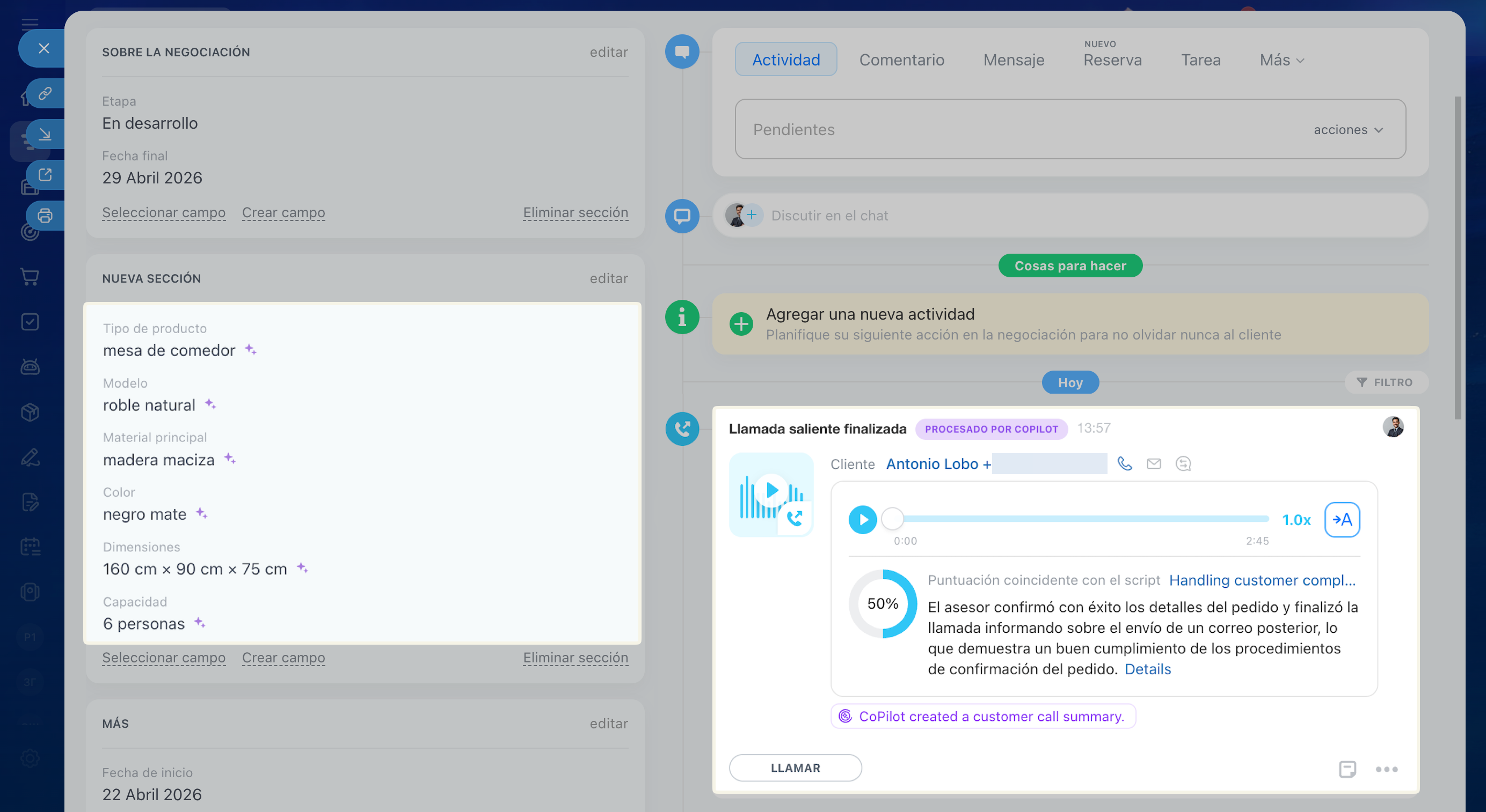 - CoPilot en CRM puede transcribir la grabación de la llamada, crear un resumen y completar automáticamente los campos en la ficha de negociación.
