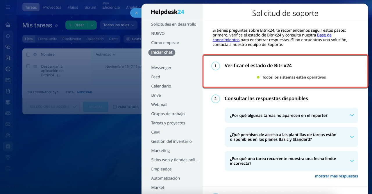 Verifica el estado de tu Bitrix24. Para ello, haz clic en Ayuda > Iniciar chat. Un estado en verde significa que todo funciona correctamente y no hay incidencias importantes. Si está en rojo, significa que ya estamos trabajando para resolver el problema; no necesitas contactar con el soporte técnico, ya que todo volverá a la normalidad en breve.