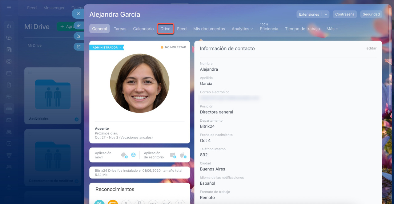Si otorgas acceso a un archivo mediante el botón Permisos de acceso, este no aparecerá en la cuenta personal de Drive de los empleados seleccionados. Para verlo, deben acceder a tu perfil y abrir la pestaña Drive.