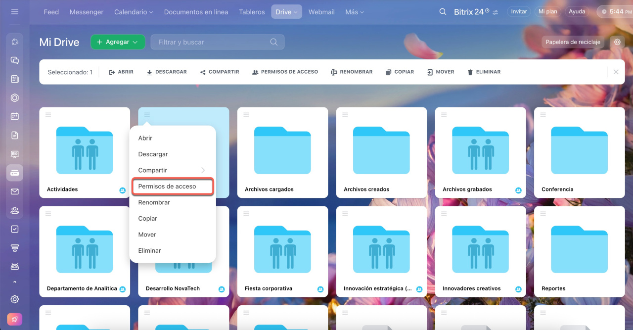 En Bitrix24, puedes compartir archivos desde tu Drive personal con tus colegas. Configura permisos de acceso para cada usuario por separado o para el departamento entero. También puedes habilitar el control de permisos extendido para archivos y carpetas individuales.