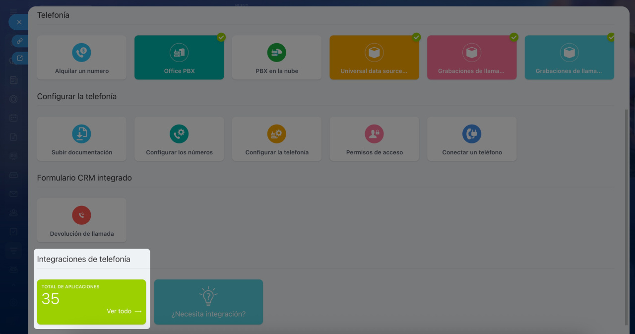 Aplicaciones REST. Instala la aplicación requerida desde Bitrix24 Market. Para hacerlo, ve a la sección de CRM > Ventas > Canales de ventas > Telefonía > Conexión > Integraciones de telefonía. Configura la conexión siguiendo las instrucciones del desarrollador de la aplicación.