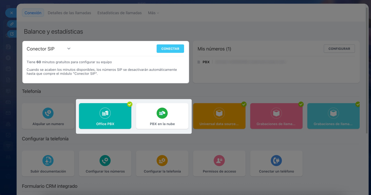 Conector SIP. Tu proveedor de telefonía te cobra por las llamadas entrantes y salientes. No necesitas recargar saldo en Bitrix24. Tienes 60 minutos gratis en Bitrix24 para probar llamadas salientes y desvío de llamadas. Para seguir utilizando estas funciones, debes adquirir la suscripción al conector SIP.